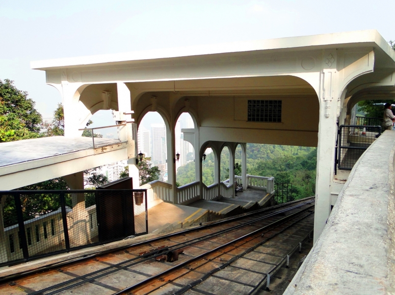 由中環山頂纜車站起步,停車場盡處的紅磚建築(即是WWF訪客中心)就是纜車徑入口。沿樓梯輕鬆步上,就在堅尼地道的車路之前,短短的距離已經是第一個車站,堅尼地道車站。先穿過橋墩底下圓拱形的通道走到車站上,站內的路燈形態十分獨特,前面沿途有著十數枝相同的路燈,這些曾經都是煤氣街燈,但現時已換上了電燈泡,只是保留了昔日的外貌。不久後,地上的纜索移動著,拉動纜車緩緩的駛過車站,駛上堅尼地道上的鐵橋,隆隆作響,從旁邊看,這道鐵橋承載著這列「龐然巨物」,感覺非常單薄脆弱呢。