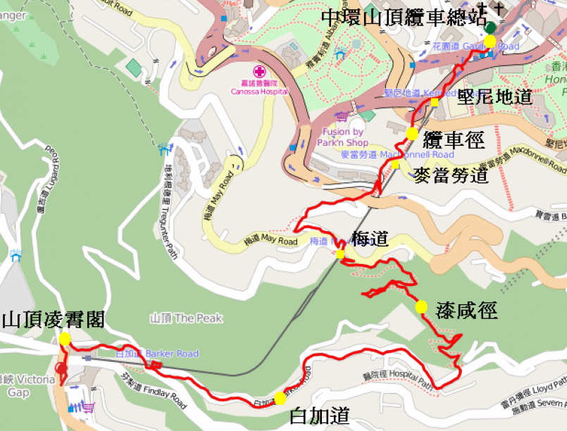 路線:中環山頂纜車總站→中區自然徑(纜車徑、漆咸徑)→白加道→山頂(3.5公里)