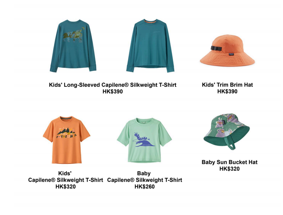 考慮到下一代對自然的熱愛,Patagonia 亦特地為孩子們製作了多款機能性服飾,包括童裝及 BB 版本的 Capilene® Silkweight T恤,以及防曬帽等多樣選擇,令孩子們也能安心、舒適地享受夏日陽光與戶外樂趣