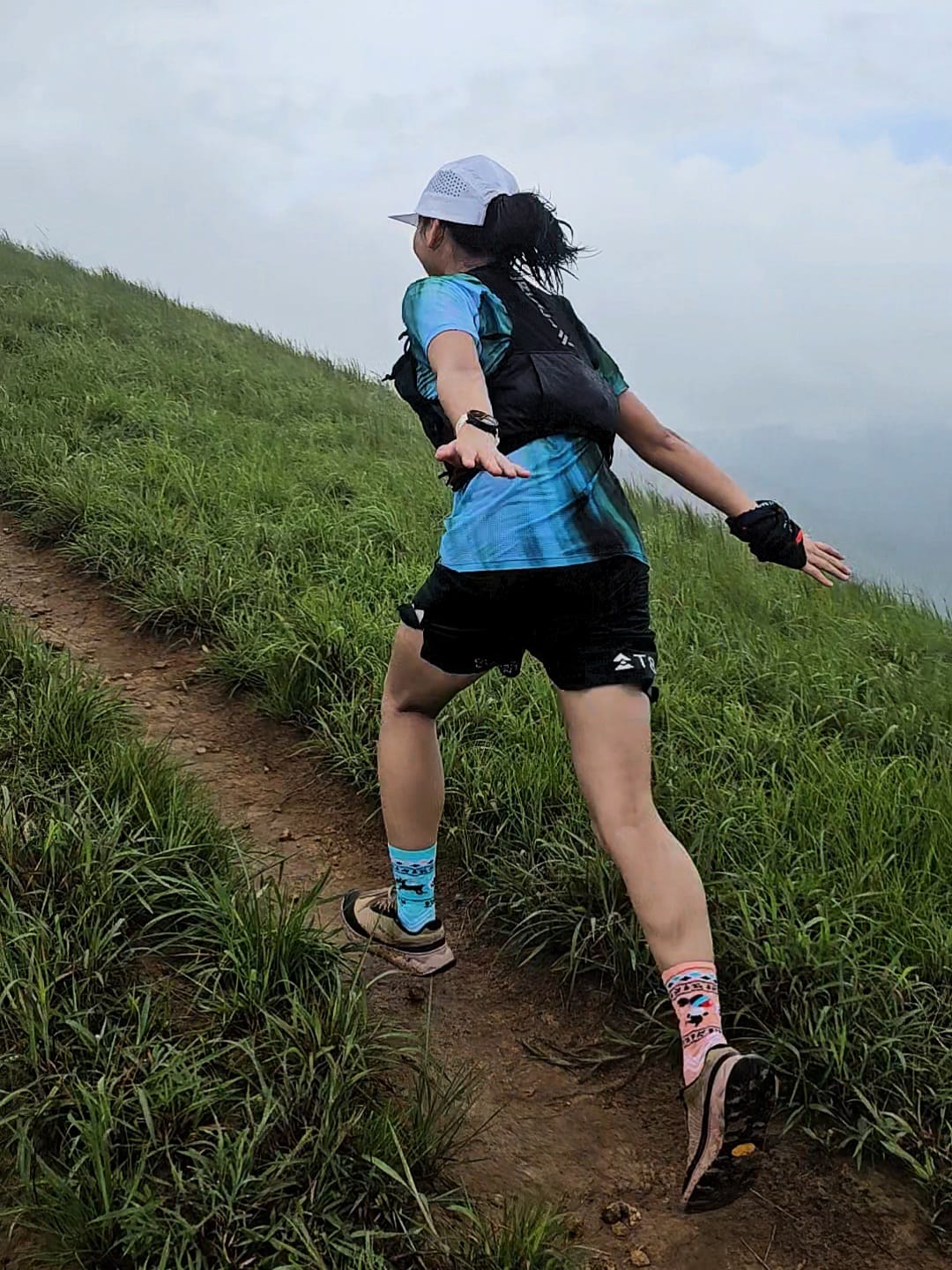 她表示鍾情越野跑的原因是喜歡和自然對抗的感覺:「公路跑更像和自己比速度,而越野的地形、天氣隨時在變,每一步都要專注判斷,那種征服陡坡、穿越樹林後的成就感,是其他運動給不了的。」縱使比賽經驗尚淺,但當問到 Hana 至今最難忘的賽事時,她感受很深的分享著:「是去年一場 47 公里毅行者賽事,颱風暴雨後,賽道泥濘到幾乎無法落腳,鞋里灌滿泥,經常跌跤。最後 5 公里完全靠意志力撐著,還要被人倒追,沖線時的我明白越野跑的魅力在於『不放棄』本身。」
