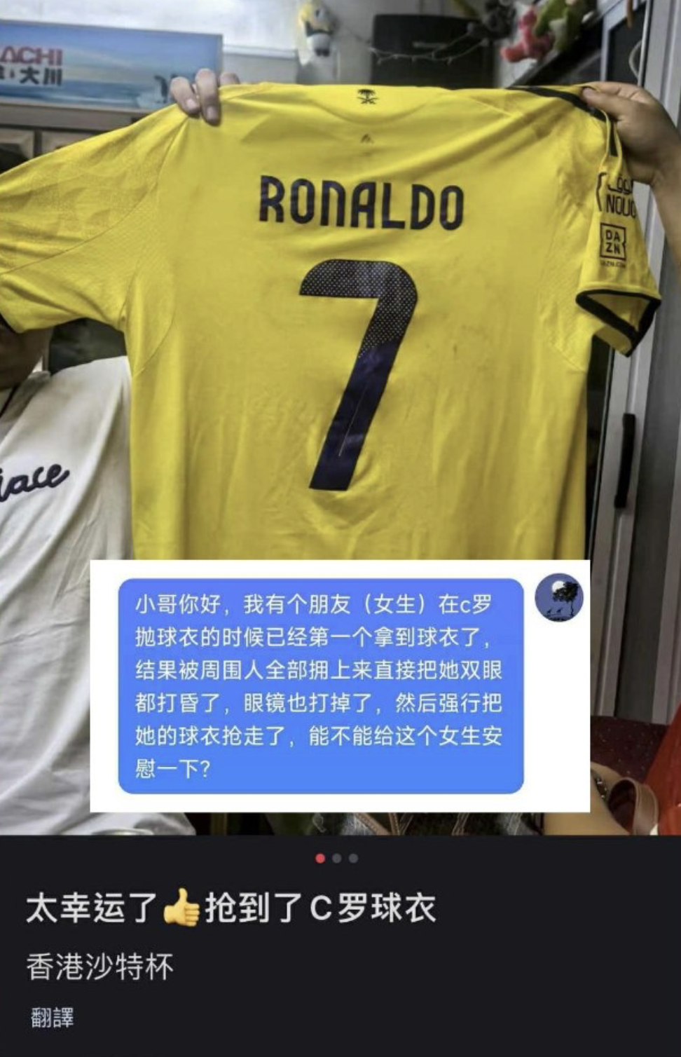 C 朗魅力除了令球迷因愛成恨之外,贏波後心晴大好的 C 朗更於完場後將球衣除下拋向觀眾席贈送予支持者,得到球衣的幸運兒亦將「戰利品」上載社交平台炫耀一番,豈料有球迷表示球衣原先是自己的女性友人率先拿到,結果被同圍的人一擁而上強搶失去,導致友人眼鏡也被打掉。
