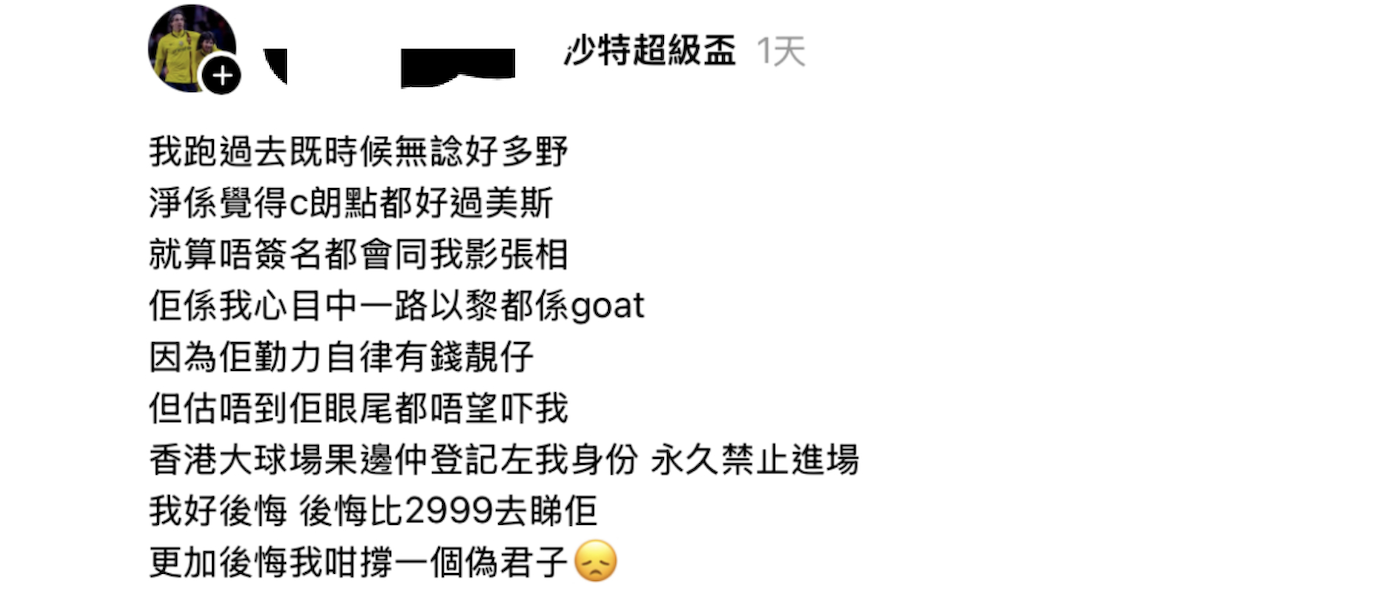 該球迷在社交平台表示:「跑過去既時候無諗好多野,淨係覺得 C 朗點都好過美斯,,就算唔簽名都會同我影張相,佢係我心目中一路以黎都係 goat,因為佢勤力自律有錢靚仔,但估唔到佢眼尾都唔望吓我!香港大球場果邊仲登記左我身份,永久禁止進場!我好後悔!後悔比(俾)2999 去睇佢,更加後悔我咁撐一個偽君子!」球迷出 post 後留言幾乎一面倒負評及恥笑該球迷的行為,有網民表示「買飛入場多數都唔係實名制,唔明白佢哋點樣可以永久禁止你再入場」、亦有不少人覺得球迷輸打贏要、行為幼稚。