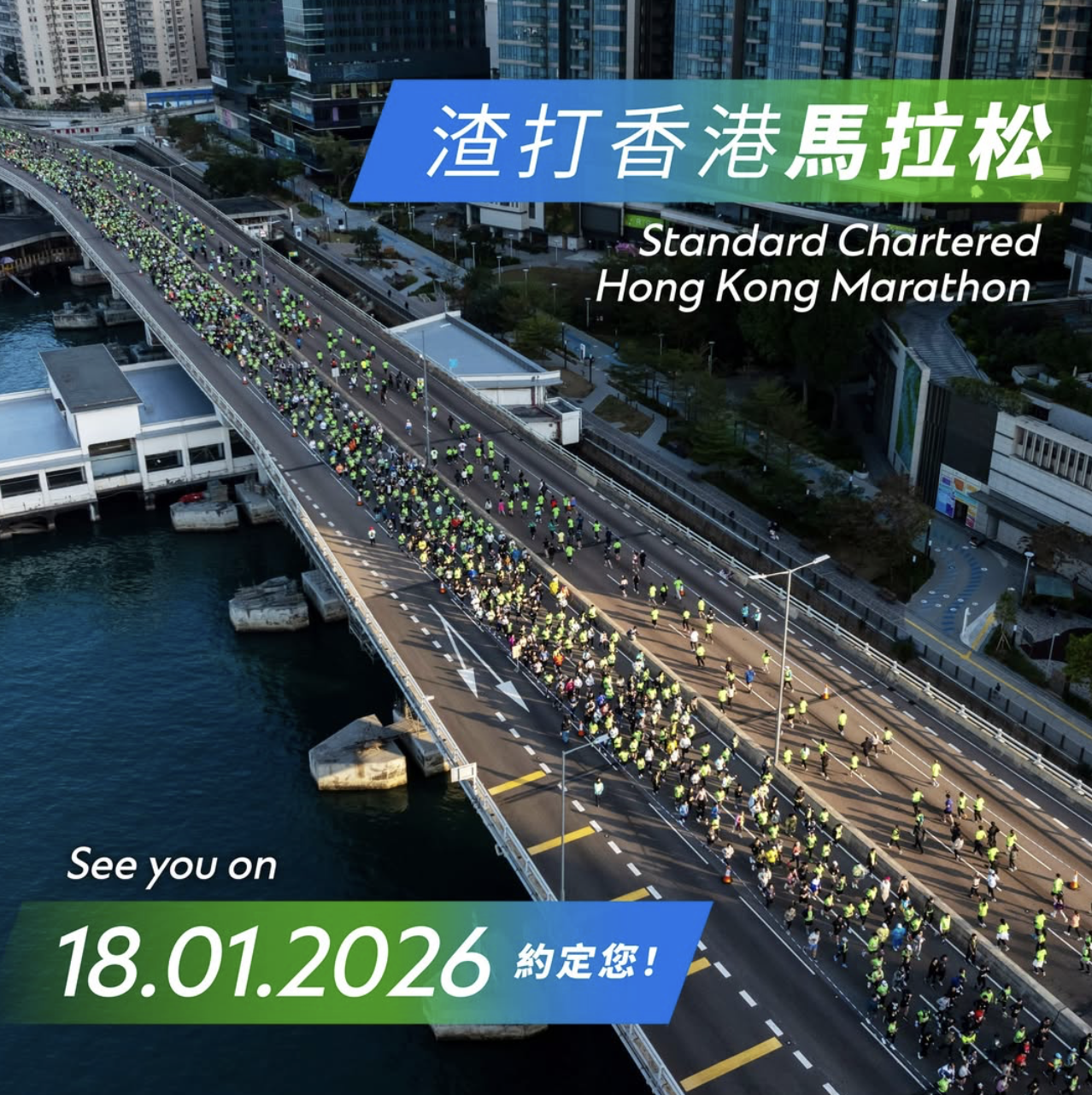 渣打香港馬拉松 2026 將於明年 1 月 18 日舉行。作為香港一年一度最多人參與的體壇盛事,賽事將設有馬拉松、半馬拉松和十公里項目,上一屆已吸引逾 74,000 人參與,包括本地及非本地跑手。公眾抽籤跑手將於 9 月 8 日至 9 月 17 日開始,本屆馬拉松名額為 1.8 萬、半馬拉松名額為 2.5 萬、於 10 公里名額為 3.1萬。