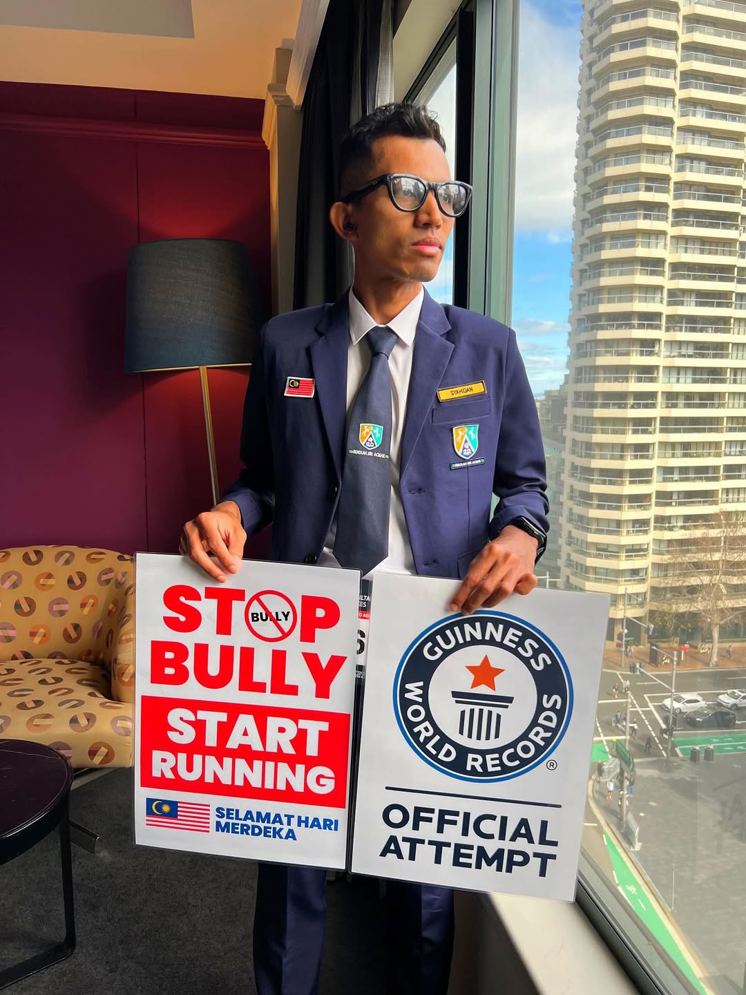 這位當地著名的跑步教練表示,著校服跑步的原因是希望引起大眾有關注校園欺凌的問題:「校園欺凌已成為馬來西亞最迫切的問題之一,影響學生的自信心、健康和未來。身為教練和未來的教師,我希望利用跑步,一項培養紀律、韌性和尊重的運動來傳播意識,激發改變!」