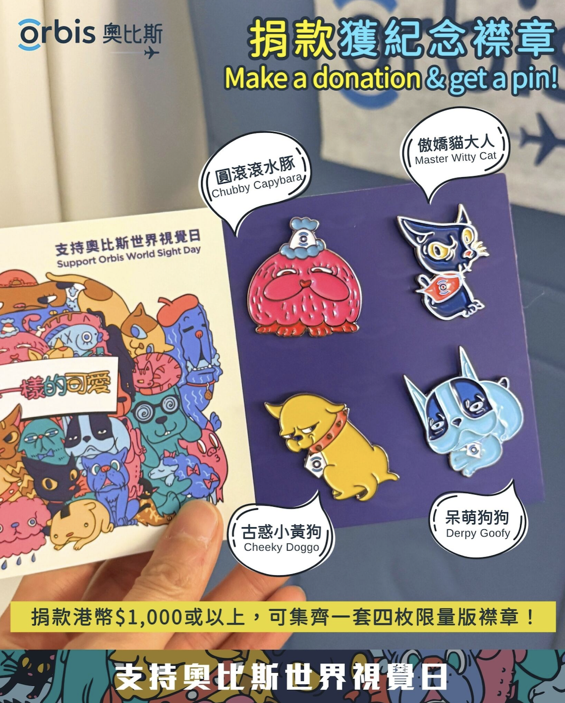 即日起至 2025 年 10 月 31 日,捐款支持「奧比斯世界視覺日」即可隨機獲贈一枚奧比斯可愛動物襟章,包括呆萌狗狗、圓滾滾水豚或傲嬌貓大人,為自己或身邊的人增添趣味色彩。