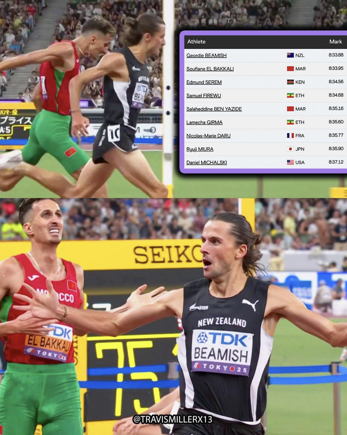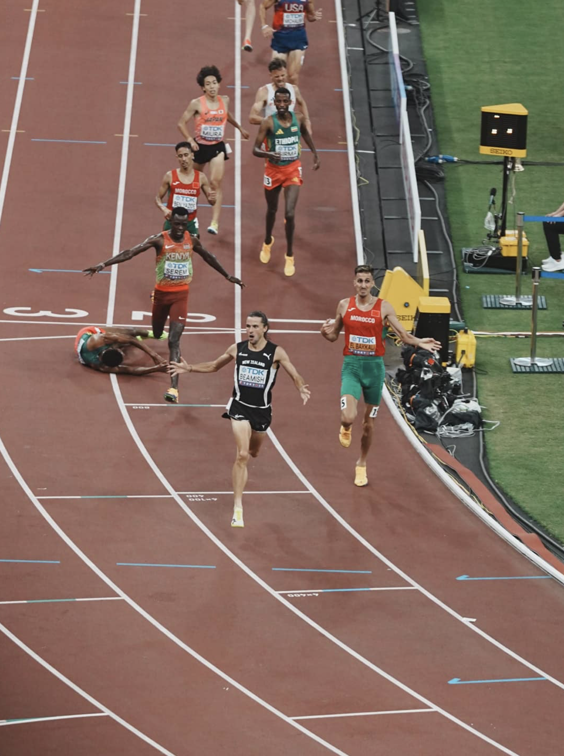 本屆世錦賽上演至今最勵志故事!昨天進行的男子 3000 米障礙賽預賽中,新西蘭選手 Geordie Beamish 在最後一圈發生意外,跌倒時更被加拿大選手 Jean-Simon Desgagnés 的釘鞋踩到臉部,但他展現驚人意志與衝刺能力,最終仍以小組第二名完賽,強勢晉級決賽。