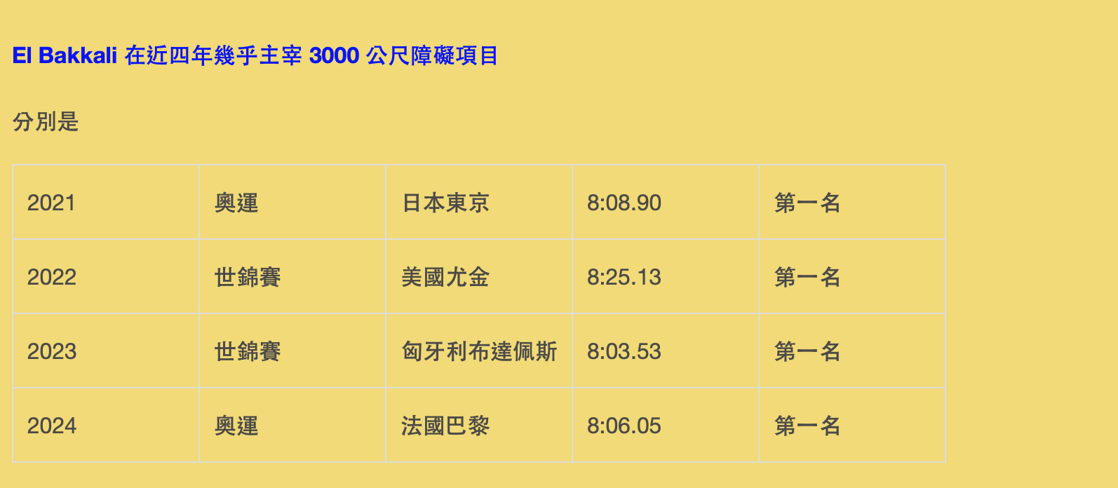 賽前大熱 29 歲的 El Bakkali 賽後坦言:「要接受這個結果很困難,但這就是高水準競技。我在最後一欄碰到欄架,打亂了平衡,雖然策略正確,但結果不是我想要的。」他甚至一度不知道對手名字,但仍展現風度:「我向來自紐西蘭的選手表示祝賀,今晚是體育精神的勝利。」
