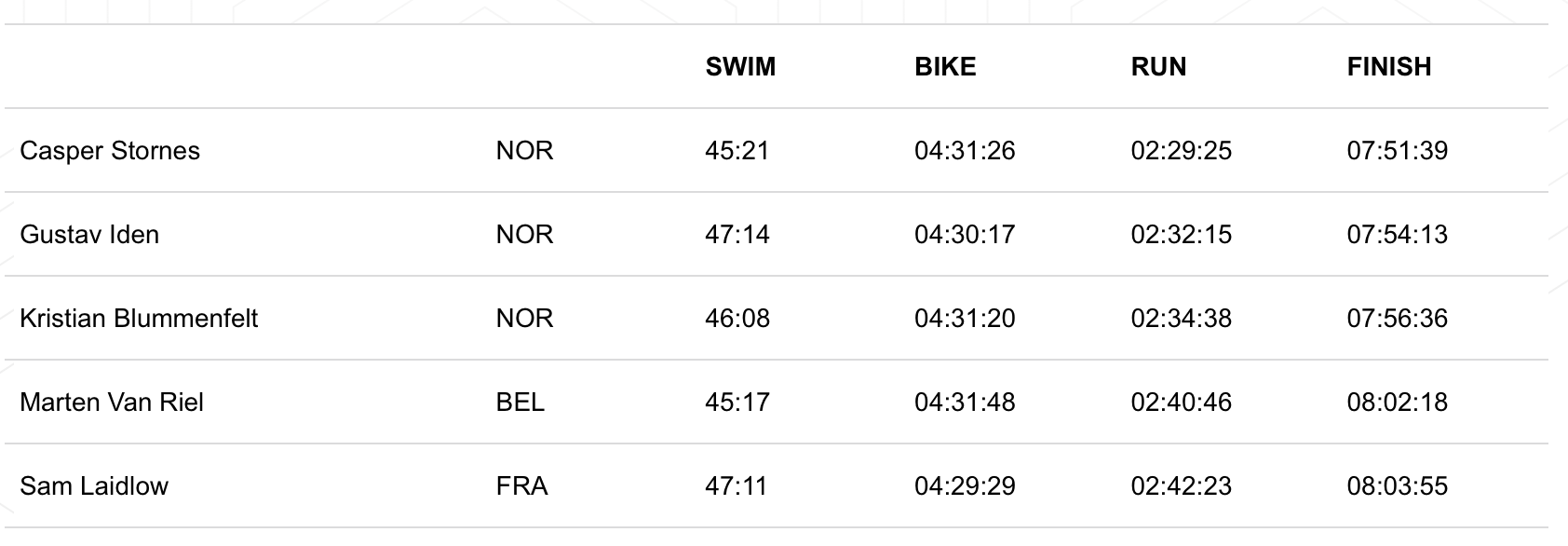 挪威選手 Casper Stornes 在法國尼斯舉行的 2025 年 IRONMAN 世錦賽上首次亮相,便斬獲了他的首個世界冠軍銜頭,並獲得了12.5 萬美元獎金和 6000 個 IRONMAN 職業系列賽積分。Stornes 以 7:51:39 的總成績奪冠,其中包括 2:29:25 的 IRONMAN 世界錦標賽馬拉松分段最快紀錄!至於他的同胞、前世界冠軍 Gustav Iden 及 Kristian Blummenfelt 則獲得亞軍與季軍,令挪威團隊順利包辦世錦賽三甲位置。