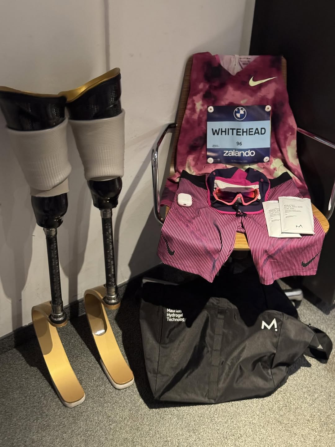 Whitehead 天生小腿缺失,裝了兩副義肢,他憑藉著自己取得的成就,被譽為「英國刀片跑手」,成為了體育界的偶像,更於 2013 年被獲授 MBE 勳銜。作為一位馬拉松運動員,但在 2012 年家鄉舉行的殘奧會上,他被告知自己的成績將不會出現在長距離比賽中,於是他轉而成為短跑明星。在那之後的十年裡,他一直在挑戰 100 米和 200 米項目的最高獎項,並經常獲得冠軍,但 49 歲的他懷特黑德在 42.2 公里的比賽中依然表現出色。計算昨天的柏林馬拉松在內,2025 年他已經完成了 16 場馬拉松比賽,總成績達到 96 場。今年稍後邁向百場全馬里程碑絕對指日可待。