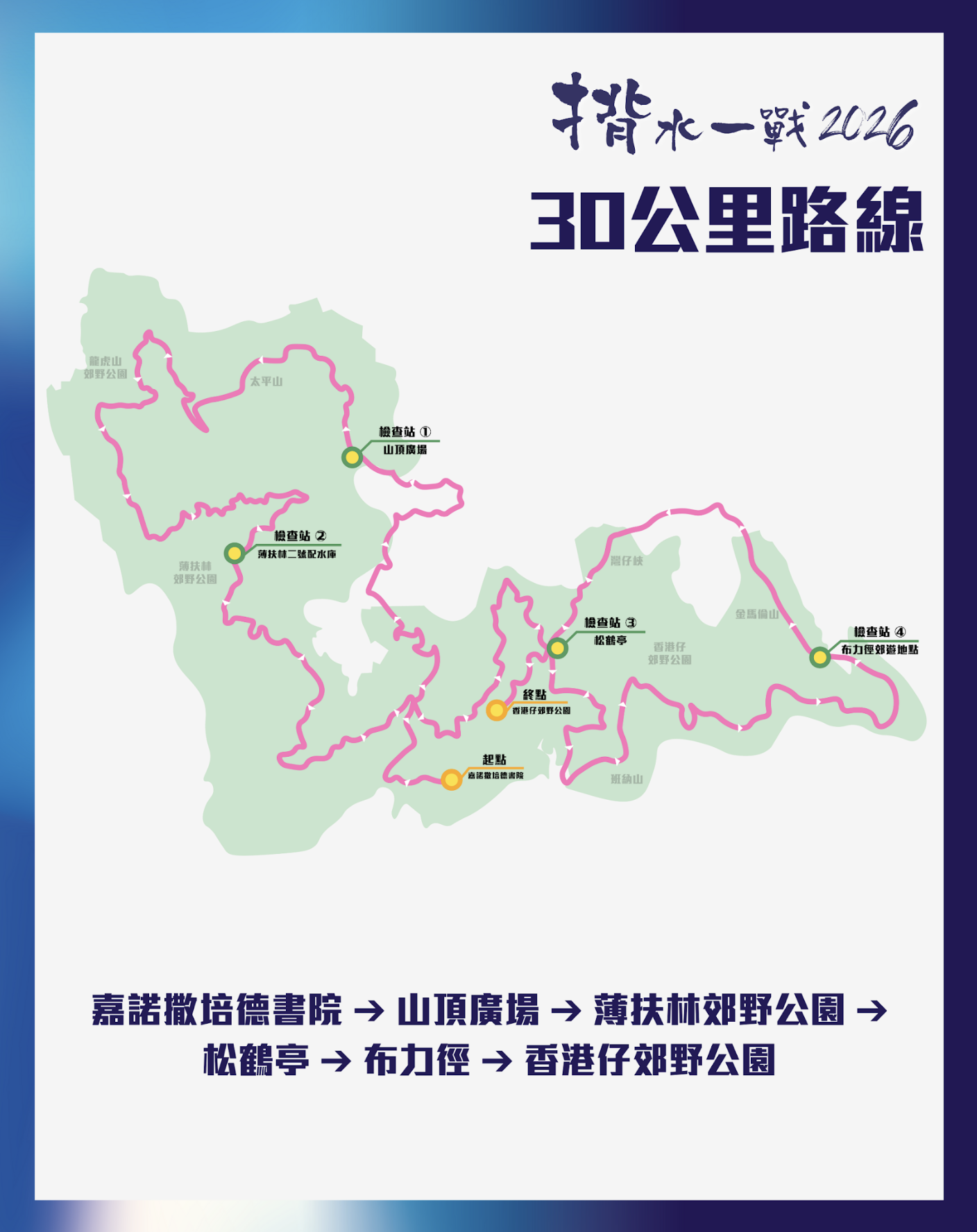| 「揹水一戰 2026」報名及賽事詳情 ▍揹水實體賽 報名日期:2025 年 9 月 26 日 至 2025 年 10 月 24 日(23:59)^ 比賽日期:2026 年 3 月 22 日 比賽組別:7 公里(體驗組)、15 公里(體驗組/奪標組)、30 公里(奪標組)、挑戰 盃賽 – 跑會盃/企業盃 ▍揹水「自由 RUN」 報名日期:2025 年 9 月 26 日 至 2026 年 3 月 5 日(23:59)^ 比賽日期:2026 年 2 月 1 日至 2026 年 3 月 8 日 成績截止:2026 年 3 月 8 日(18:00) 報名網站:http://event.adropoflife.org 活動網站:https://raceforwater.adropoflife.org |