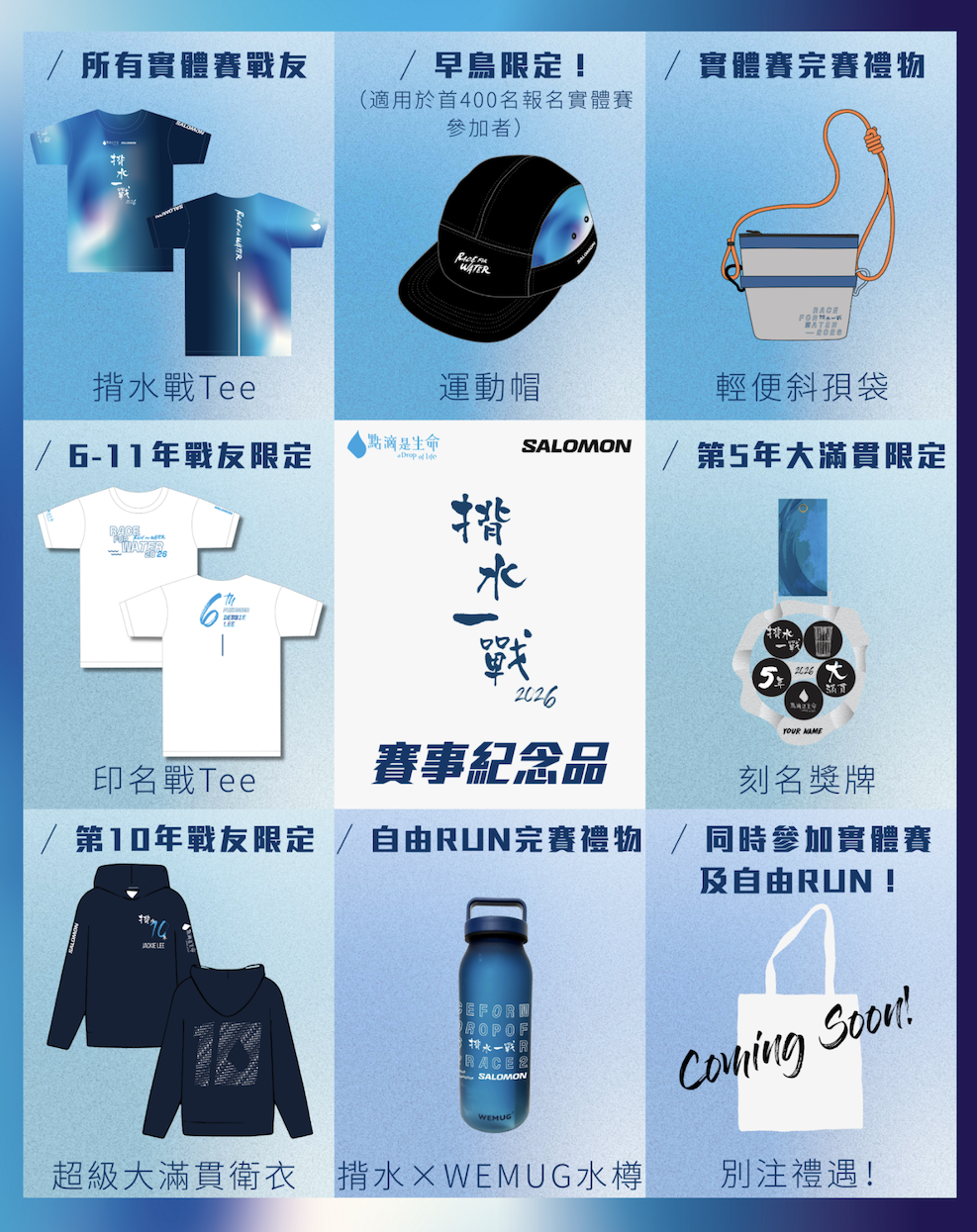 多年支持的參加者同樣不會失望,凡於第 5 年參加實體賽者,將額外獲頒大滿貫刻名獎牌,第 6 至第 11 年完成實體賽者,則獲贈大滿貫印名 T 恤,彰顯堅持不懈的精神與里程碑。今年新增的「自由 RUN」組別,則為參加者準備了 揹水一戰 X WEMUG 聯乘水樽,將環保與慈善精神融入日常。而同時報名參加實體賽及自由 RUN 的跑手,更可享有特別禮遇,雙重紀念,雙倍滿足!