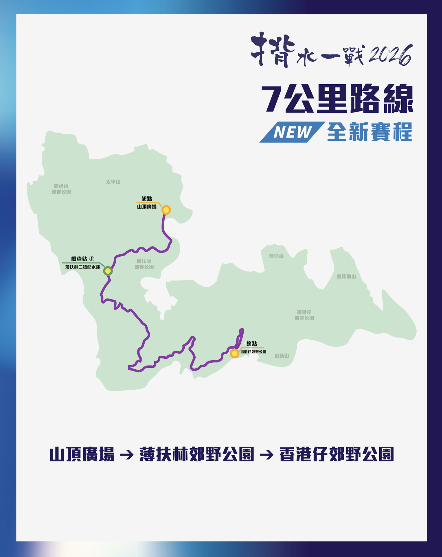 「揹水一戰 2026」今年首度增設短途路線 7 公里體驗組,號召更多新手落場參與,輕鬆感受揹水挑戰的魅力;延續往年傳統, 15 公里賽事則分為「體驗組」與「奪標組」,滿足不同程度跑手的需要;而 30 公里賽程則專為勇於突破極限的參加者而設,今年只設「奪標組」,挑戰性十足。