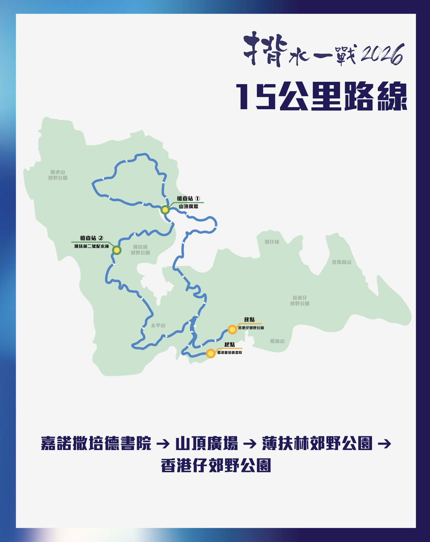 跟往年一樣,15 公里及 30 公里賽程將由「嘉諾撒培德書院」出發,終點設於「香港仔郊野公園」。當中 15 公里路線將途經山頂廣場及薄扶林二號配水庫,30 公里賽事則再經松鶴亭及布力徑,挑戰更高難度。而新增設的 7 公里路線,則會於新地點起步!參加者將由山頂廣場起步,沿薄扶林郊野公園跑至終點香港仔郊野公園。不論專業跑手或新手,皆可找到適合自己的賽道,憑著善心挑戰潛能,為缺水居民出一分力。今年亦將續辦 「跑會盃」及 「企業盃」,讓參加者於賽道上展現團隊精神,在爭奪榮譽同時亦貢獻慈善力量。