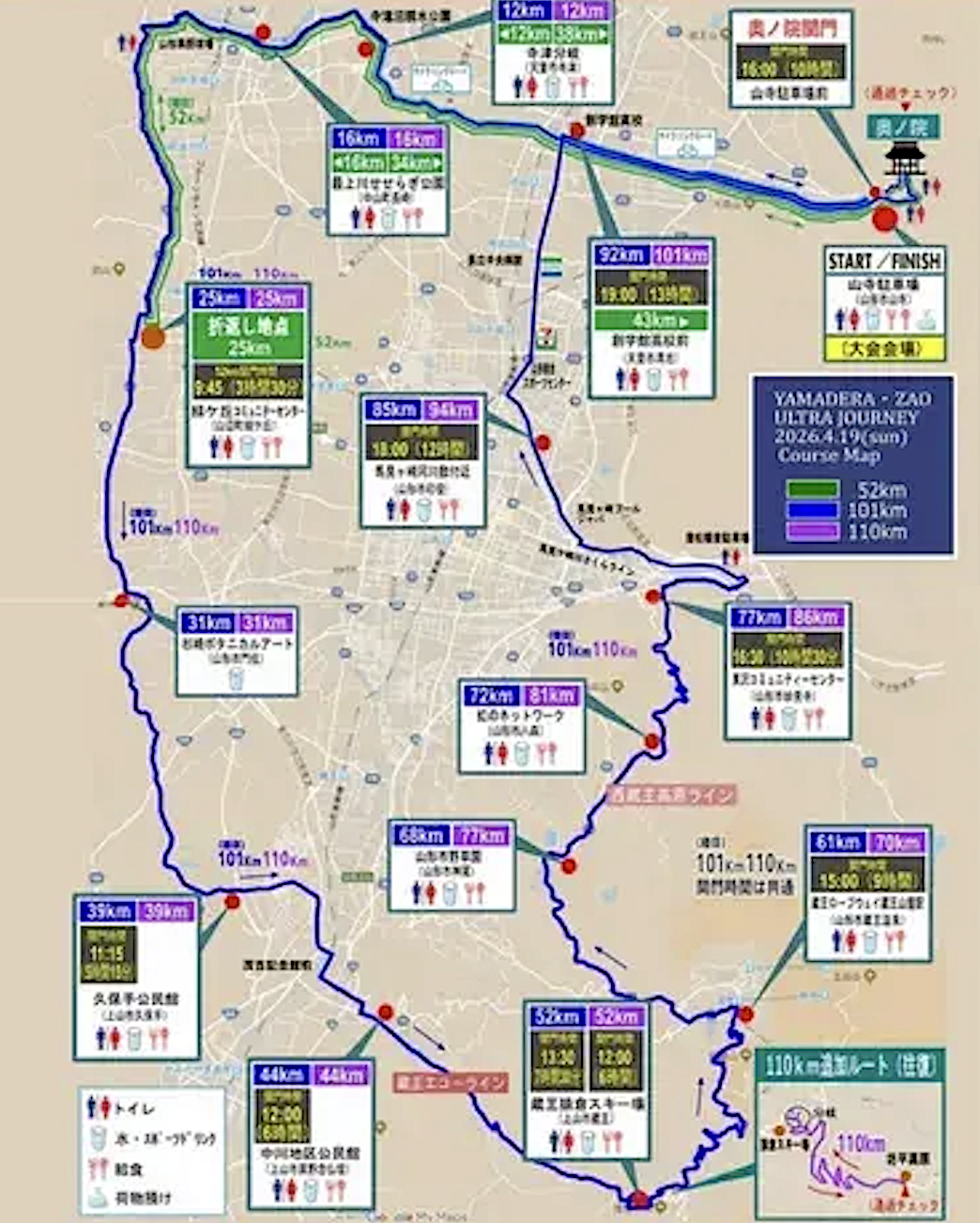 山寺藏王超級馬拉松是一場在日本山形縣舉辦的超馬賽事,路線以山寺、藏王區域為核心,涵蓋天童、中山、山邊、神山這 5 個城市、城鎮和村莊。 參賽者可以一邊享受櫻花和雪景交織的美麗風光,一邊品味觀光名勝、溫泉和山形的美食。賽事提供 52 公里、101 公里、110 公里等組別,讓跑者體驗當地文化、欣賞美景,並在補給站,提供各種學校午餐,包括豐盛的新鮮出爐的成吉思汗烤羊肉、山形特產蕎麥麵、著名的甜點如諾西梅等地道特色美食。