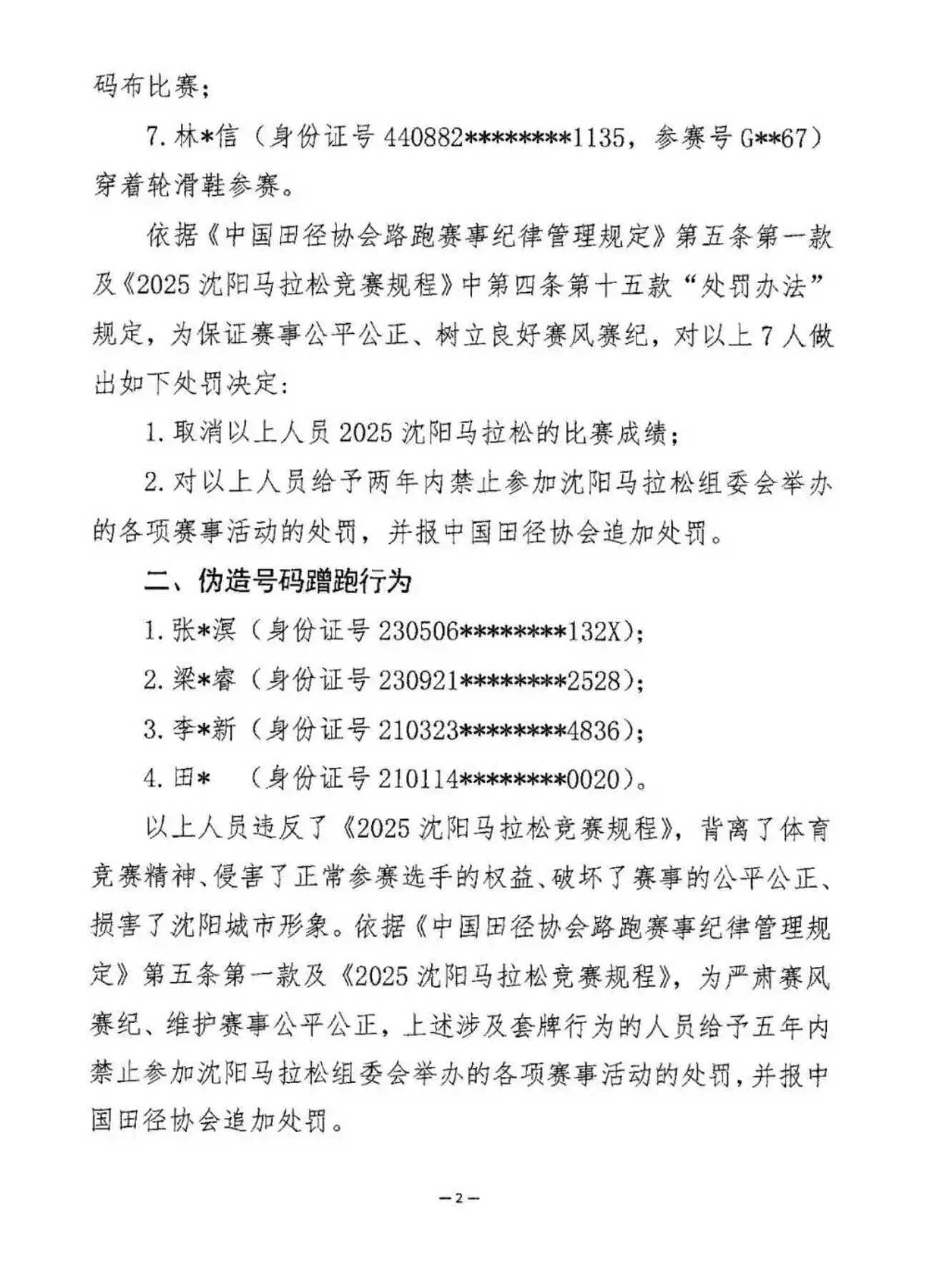據了解,本次共查出 11 名違規選手,其中 7 人被禁賽 2 年。這 7 人當中有 6 人涉及轉讓號碼布替跑的行為。諷刺的是,還有 1 名選手竟然著暴走滑輪鞋參加比賽,該名選手還在擁有百萬粉絲的林某網紅抖音出鏡,組委會對其開出禁賽 2 年的處罰。大會表示,今年沈陽馬拉松剛結束不久,網上就出現了不少選手舉報偽造號碼布蹭跑的行為。目前組委會已發現 4 宗偽造號碼蹭跑的行為,組委會對以上 4 人開出了禁賽 5 年的罰單。