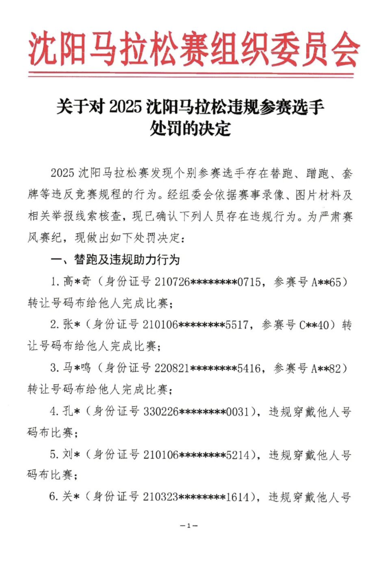 上月舉行的沈陽馬拉松有多達 2 萬人參賽,是內地省會大型規模級別賽事,為遵守國家體育部門嚴肅處理路跑違規事項綱領,賽後賽事組委會對外發出一張共有 11 名 DQ 跑手的名單,組委會表示,11 名參賽選手因嚴重違反賽事規則被取消成績,並處以最低 2 年、最高 5 年的禁賽處罰,部分情節惡劣者還被報請中國田徑協會追處罰。違規事項事項中,6 人涉嫌代跑、4 人涉嫌偽造號碼布、最誇張一位被 DQ 跑手,光天化日比賽之下穿著滑輪暴走鞋滑行「跑步」。