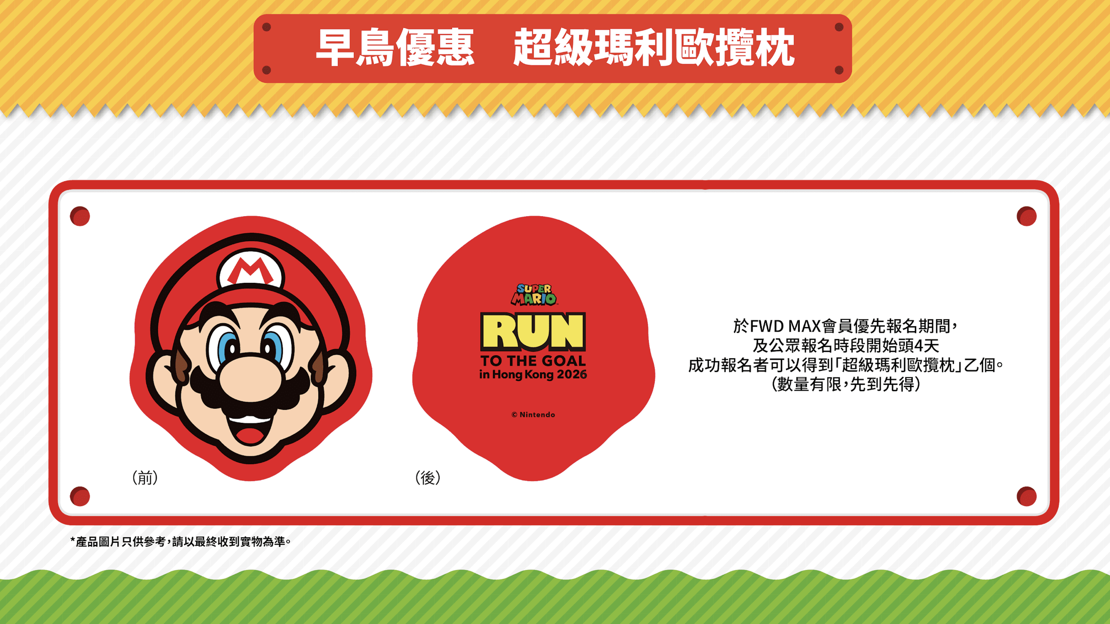 由 Running Aces Event Limited (R-aces) 主辦,並獲任天堂(Nintendo)官方授權、FWD 富衛保險呈獻的「SUPER MARIO: RUN TO THE GOAL」,將於 2026 年 3 月 15 日(星期日)假香港科學園盛大舉行。特設 4 公里、2 公里及 1 公里賽道。設置多個通關打卡位,務求為大眾帶來前所未有的運動與娛樂體驗。即日起至 10 月 31 日成功報名朋友,將會獲得早鳥限定福利,超級瑪利歐攬枕一個。