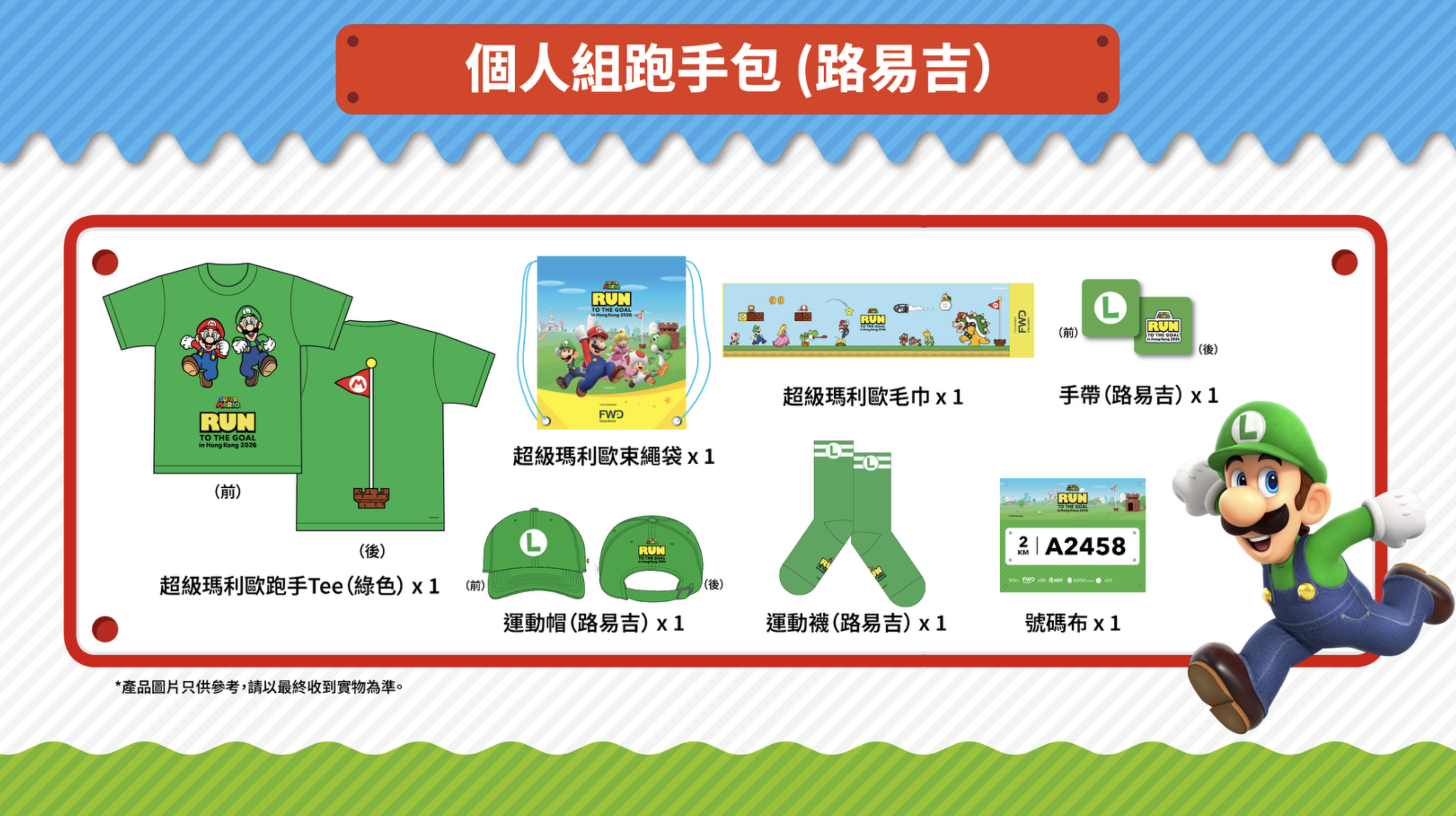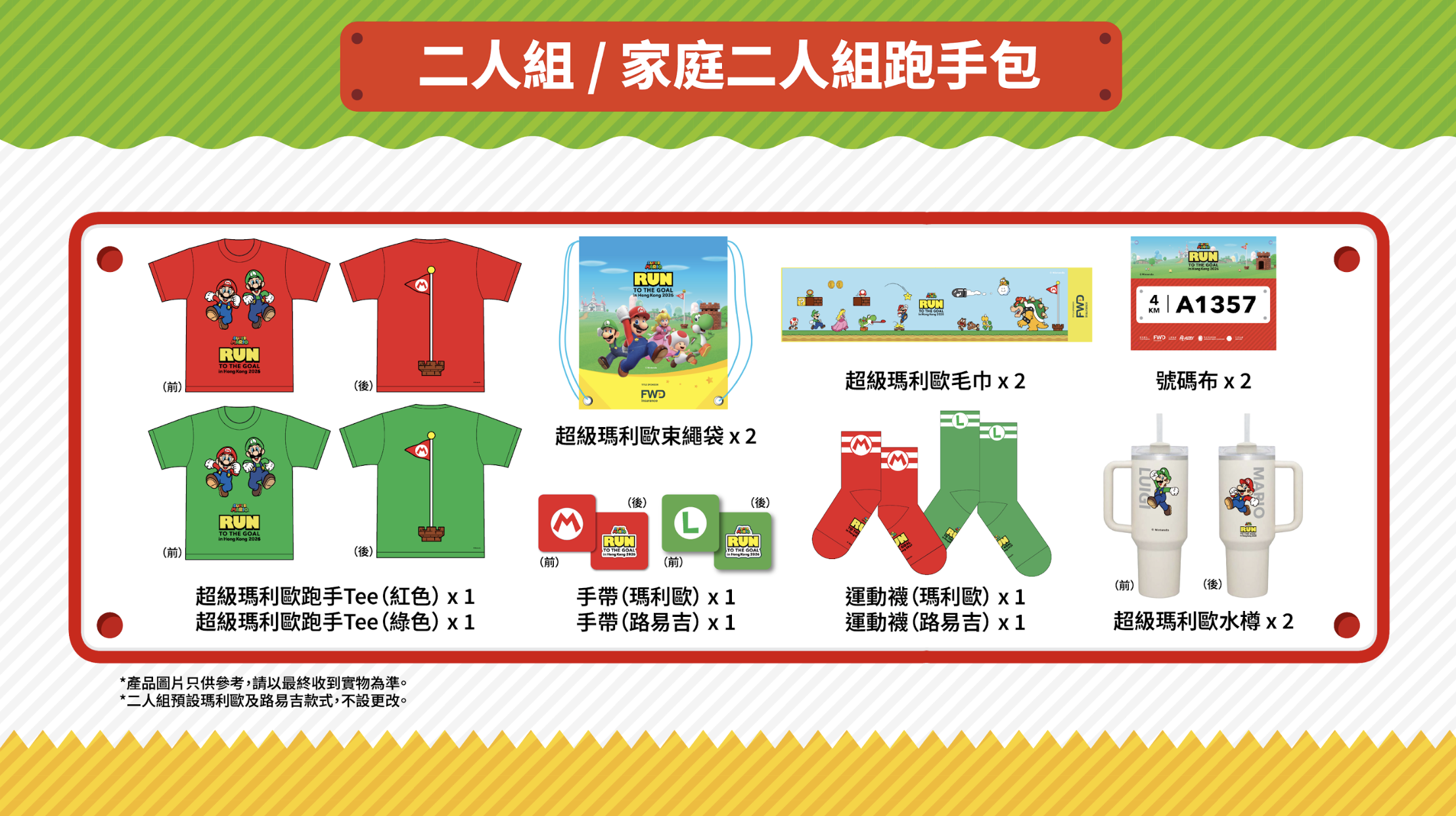 成功報名二人組賽事的跑手,都可以獲得一套「二人組跑手包」,內含 超級瑪利歐跑手 Tee(紅色)及 超級瑪利歐跑手 Tee(綠色)各1件、還有 超級瑪利歐毛巾 2條、超級瑪利歐束繩袋 2個和 號碼布 2塊,更特別附贈 超級瑪利歐水樽 2個、 運動襪 及 手帶 各1對(瑪利歐款及路易吉款)。