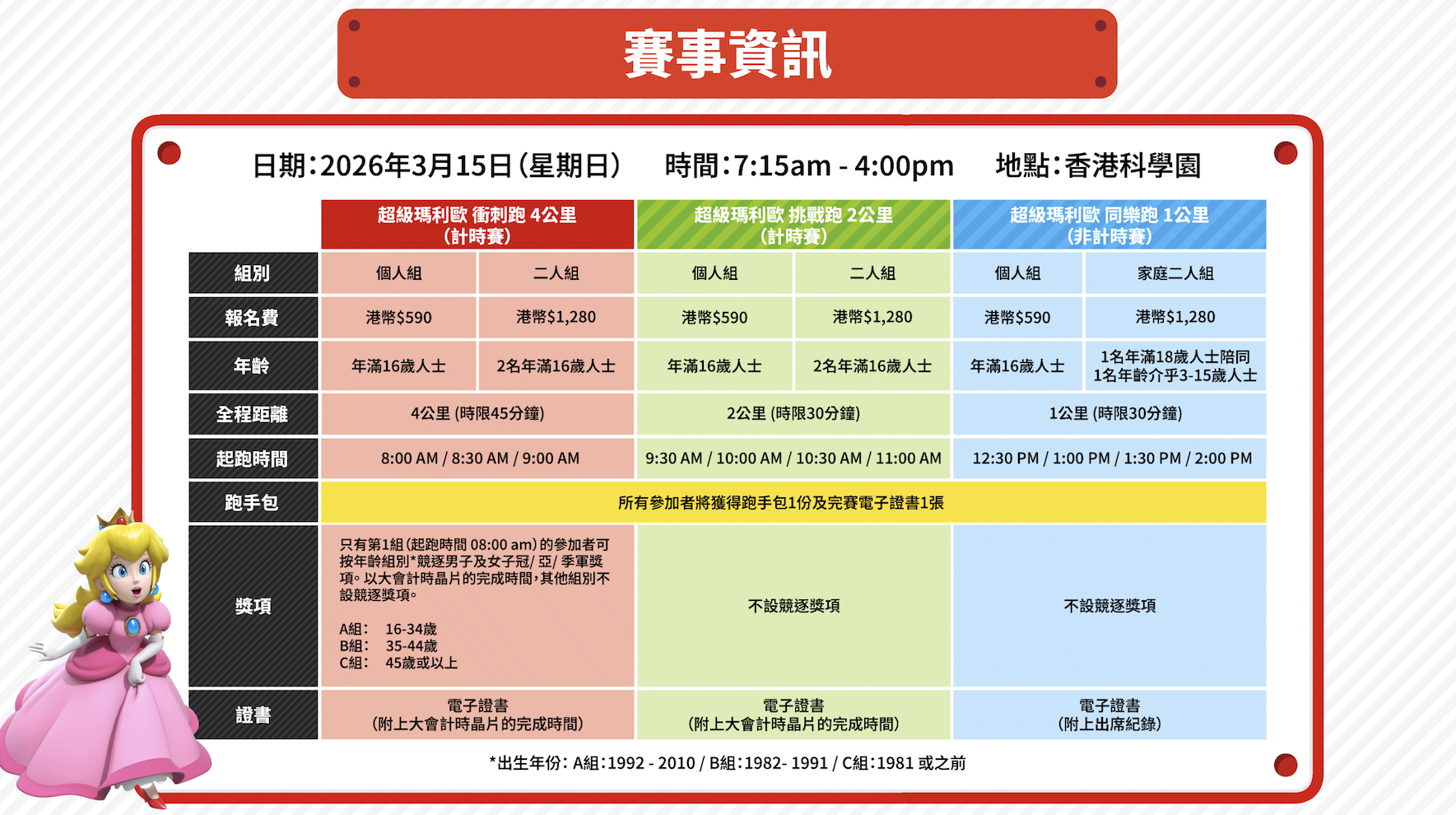 | 賽事資訊 日期: 2026 年 3 月 15 日 (星期日) 地點: 香港科學園 組別: 個人組 港幣 $590 二人組 港幣 $1,280 報名網站: www.supermarioruntothegoal.com 早鳥報名:即日起至 10 月 31 日 |