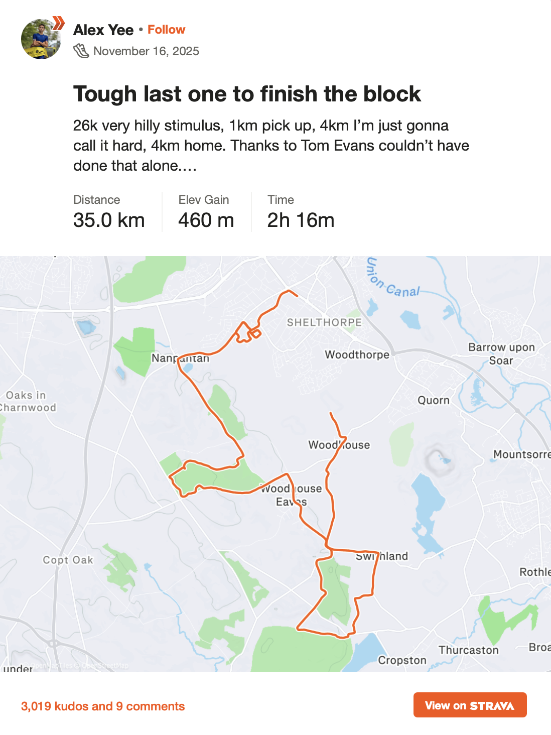 同時,透過腕錶記錄的訓練數據,我們可以看出 Alex j賽前並沒有刻意減少訓練量。他在比賽前四周左右達到了訓練量最大的一周,跑步超過 170 公里,騎單車 250 公里。這意味著他那一週在跑步和騎乘兩項運動上的總訓練時間達到了 20 小時——這還不包括他進行的肌力訓練和游泳。
