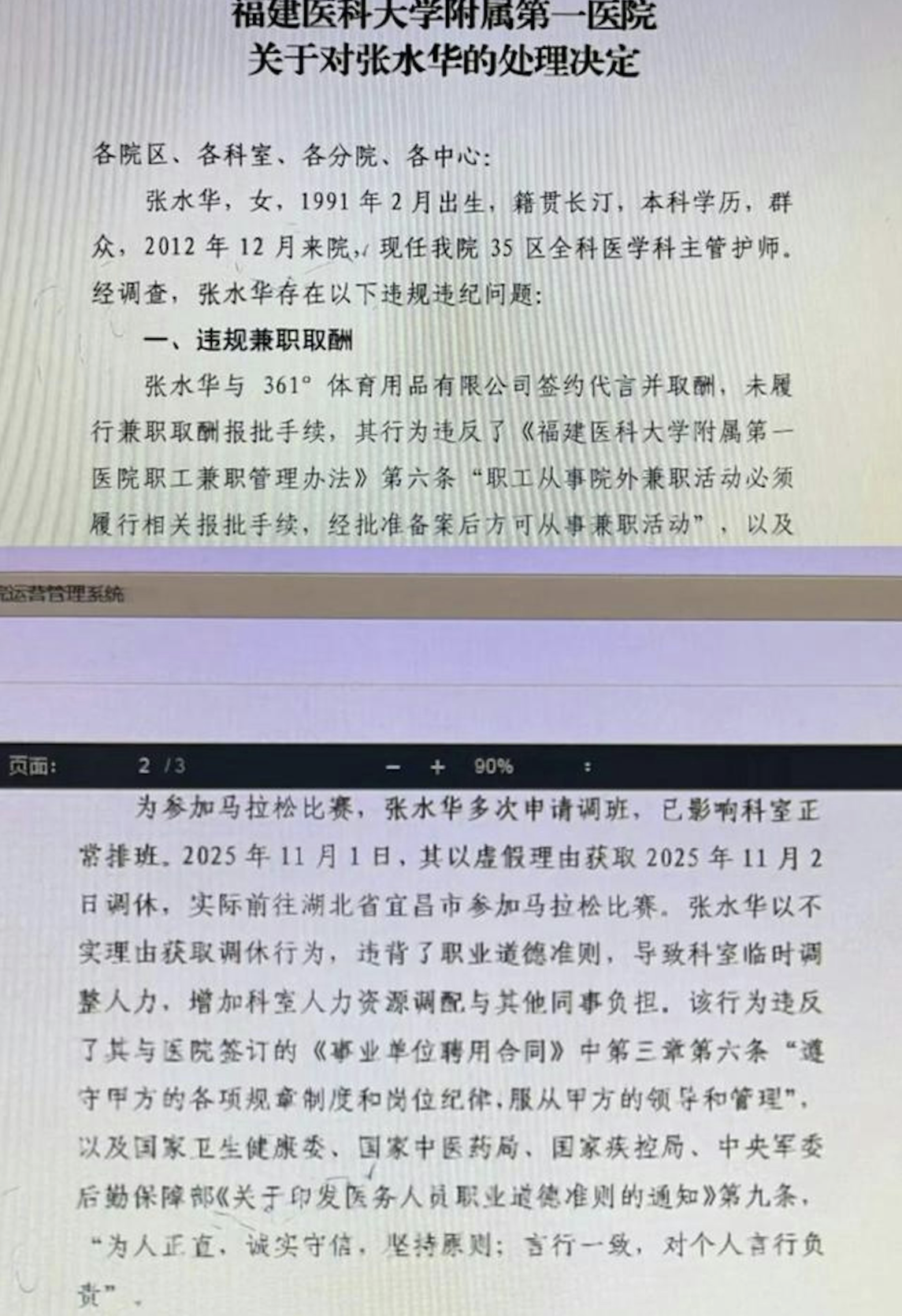 因在 8 月哈爾濱馬拉松奪冠後,受訪時哭訴希望單位領導支持其調休參賽的內地「最快女護士」張水華,其所屬醫院,福建醫科大學附屬第一醫院的內部通報昨天(9日)被內地傳媒曝光,通報標題是《福建醫科大學附屬第一醫院關於對張水華的處理決定》,該文件指出張水華存在違規兼職取酬的行為,被醫院警告處分 6 個月,並不能參與 2025 年評優。