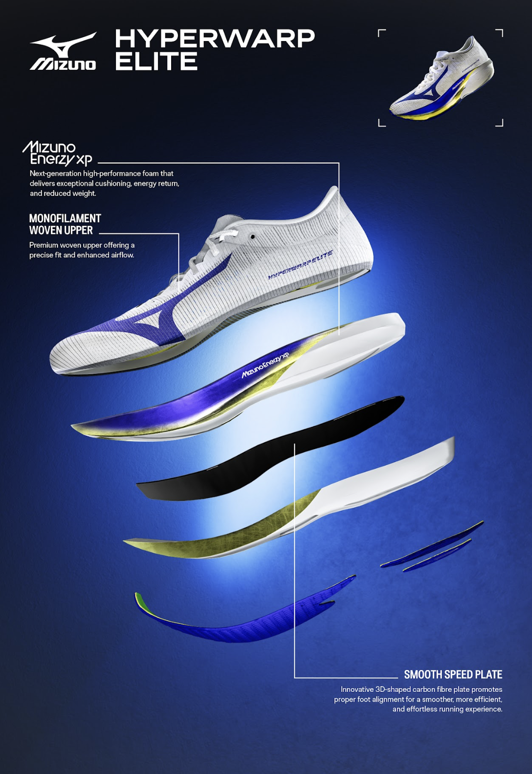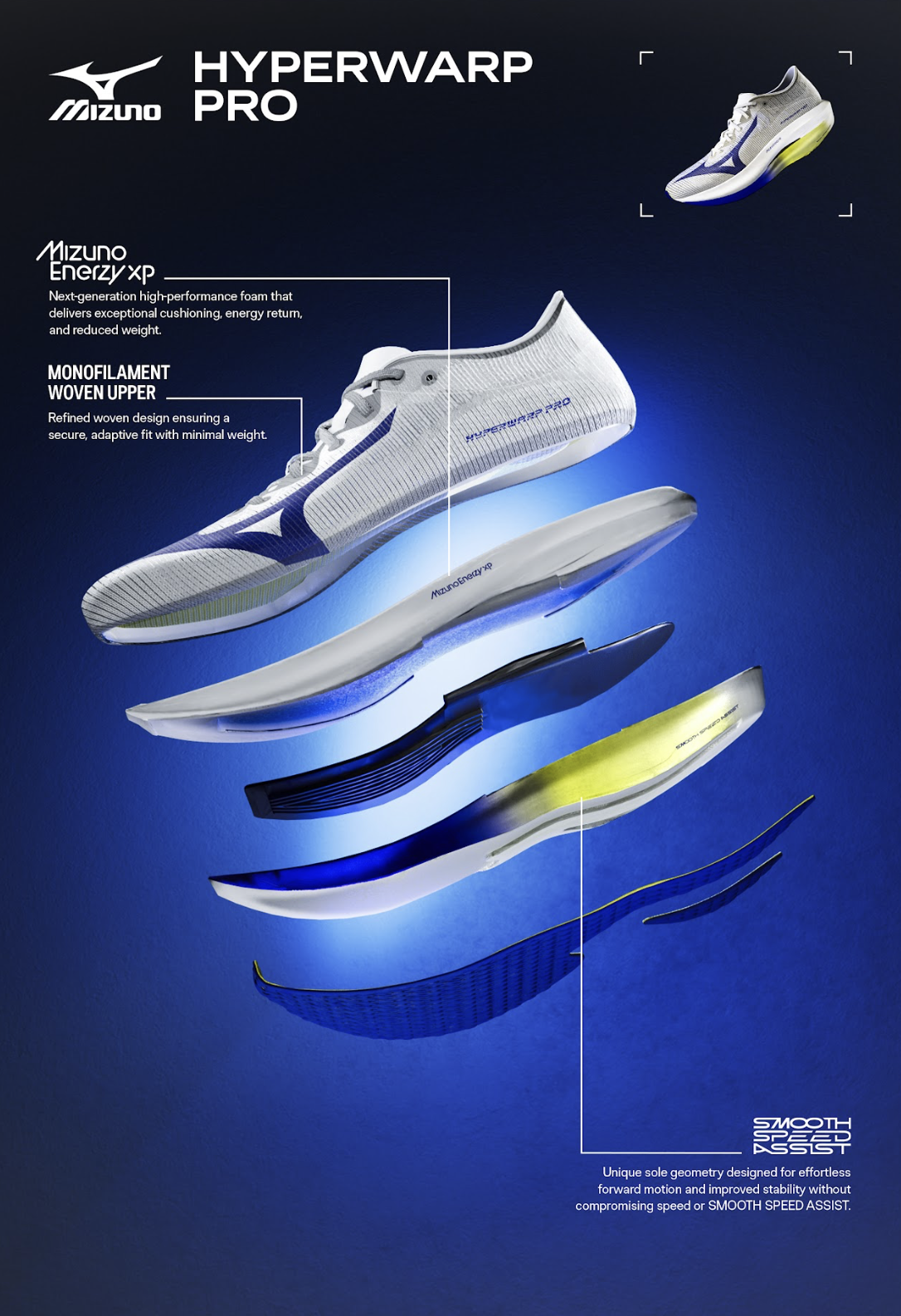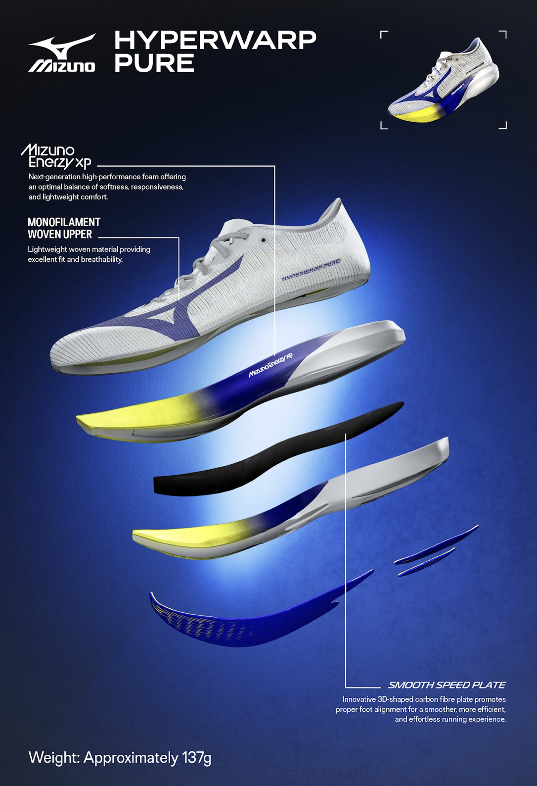 HYPERWARP 系列 3 個鞋款均以灰白色鞋身撞上藍黃色中底,同時具備不同特性的高回彈 MIZUNO ENERZY XP 中底,提供強勁的能量回饋,同時兼具卓越的柔軟與輕盈感。鞋領結構上,有著標準鞋領形狀,提供穩固貼合感,亦改良鞋踭海綿區域,減輕重量。鞋面採用全新單絲編織材料,兼顧輕量與貼合,在高速奔跑時依然保持穩定。輕薄的鞋舌材料柔軟輕巧,同時保持透氣特性。鋸齒形鞋帶設計在高速奔跑時穩固不易鬆脫。鞋底備有G3大底膠粒,特殊樹脂與多點抓地紋理設計,實現極致的抓地力。