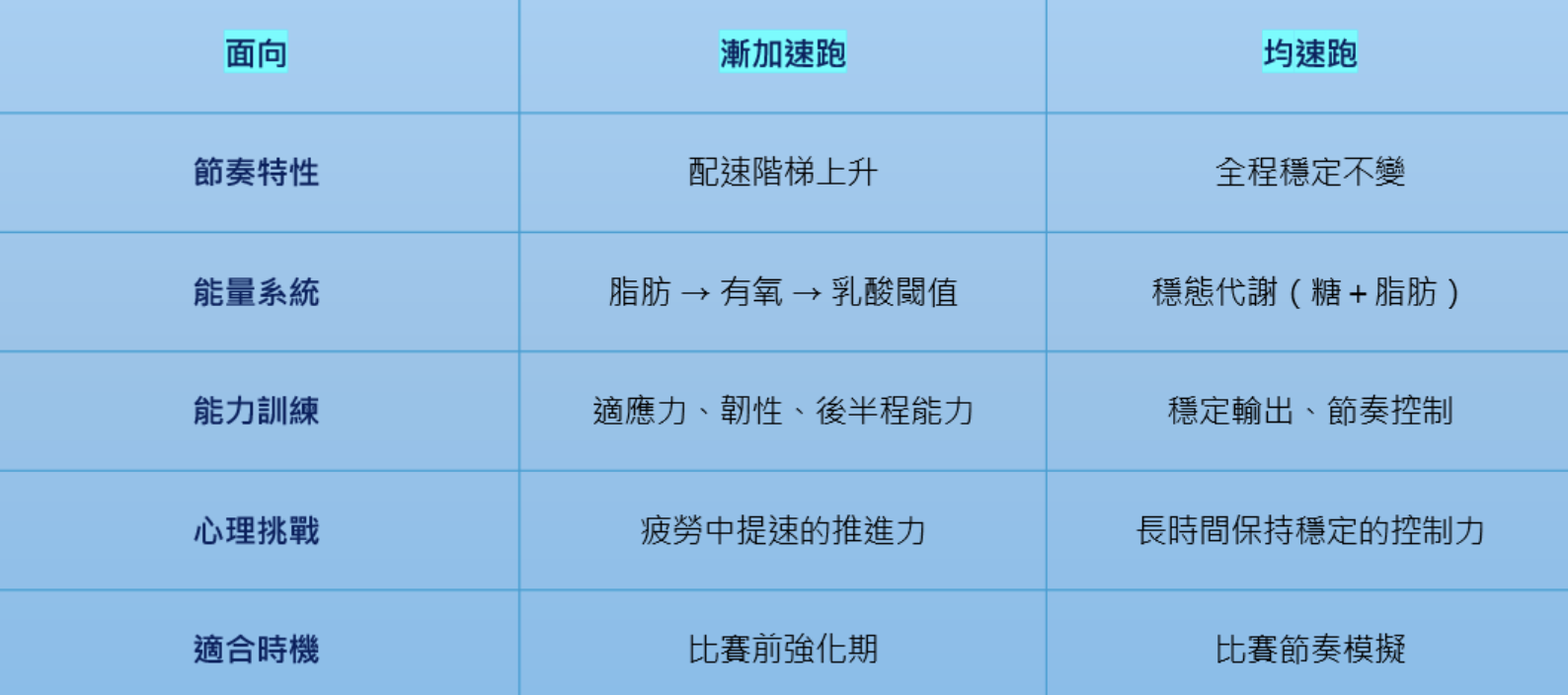 兩者之間最大的差異在於:均速專注「穩定輸出」,漸加速則在「疲勞中給予追加刺激」。