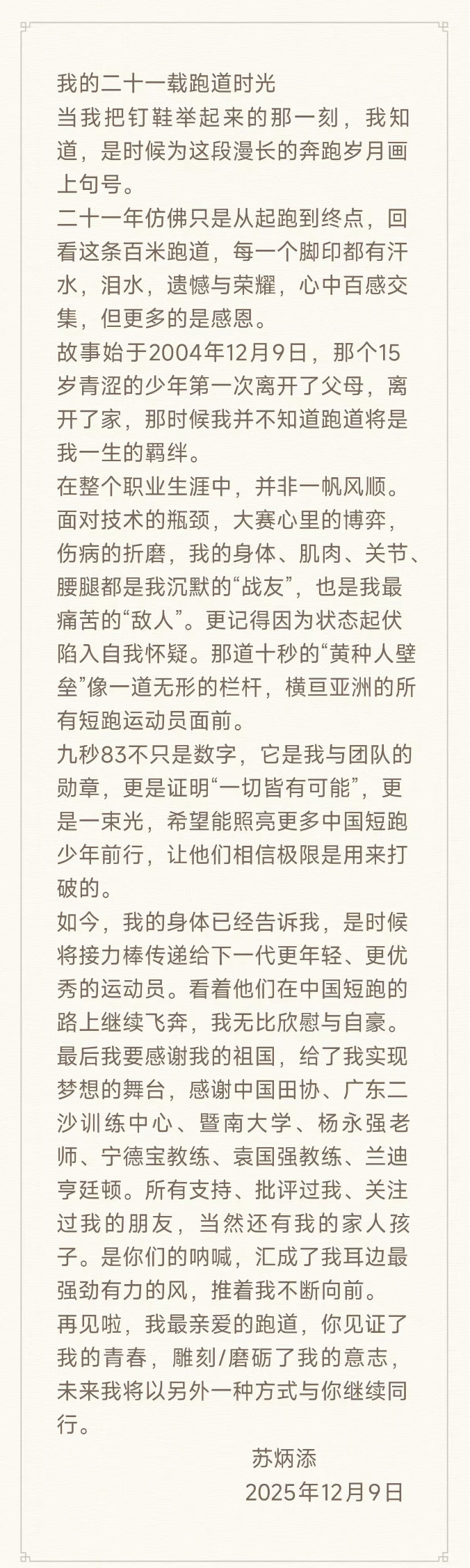「我突破過極限,也找到過極限,真的是做到跑到跑不動了。」在挑戰了各種不可能之後,在向終點全力奔跑了21年之後,終於到了說再見的時刻。2025 年 12 月 9 日,蘇炳添發文官宣退役。