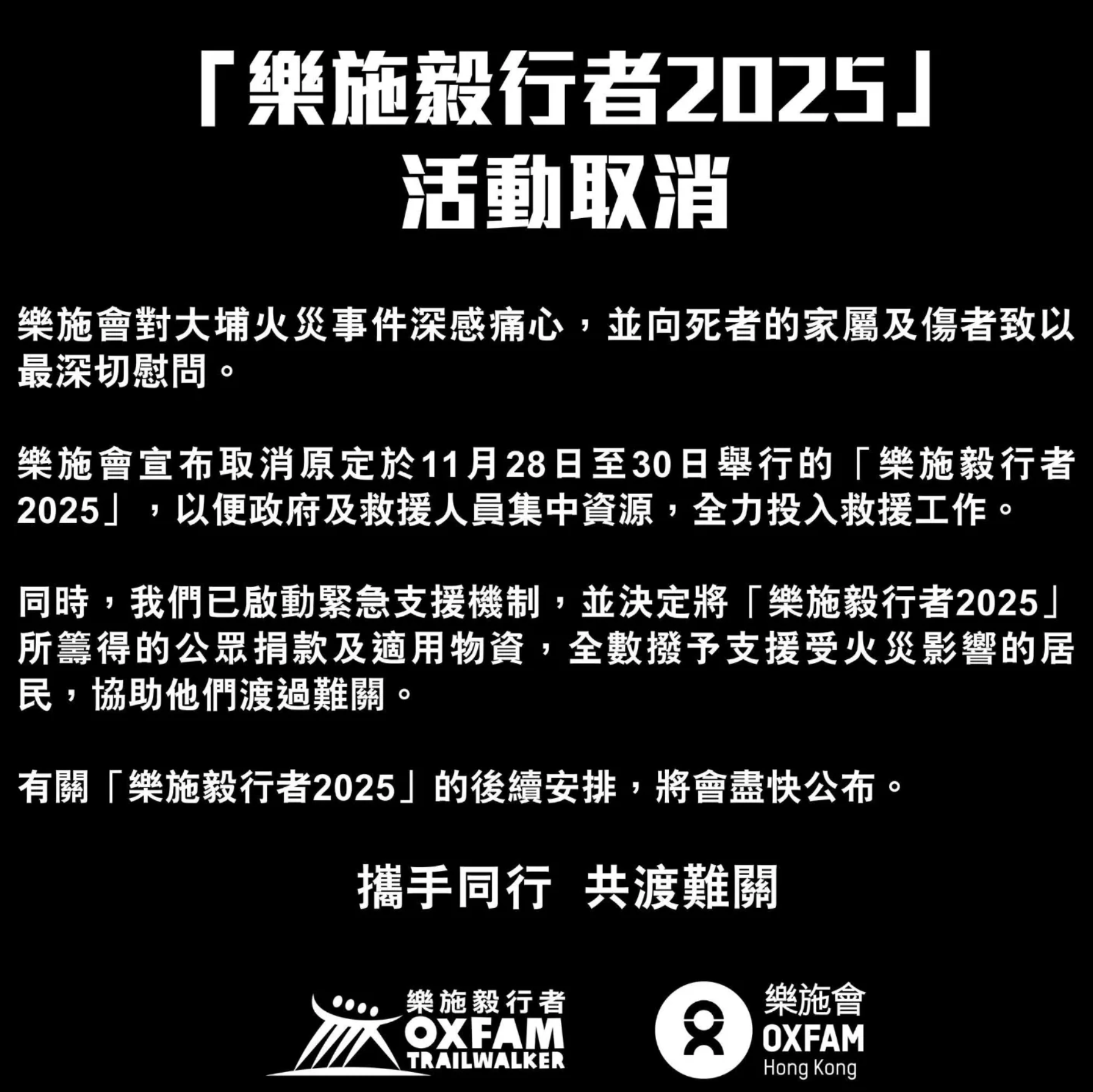 11月本港發生了大埔宏福苑火災慘劇,導致多人死傷,事件令全港陷入一片愁雲慘霧氛圍中,同時,事件令本港多項體育活動取消及延期,當中預計有大量跑手參賽的「樂施毅行者2025」亦決定活動取消,以便政府及救援人員集中資源,全力投入救援工作,同時大會亦宣布活動全數公眾捐款及適用物資撥予支援大埔火災居民。