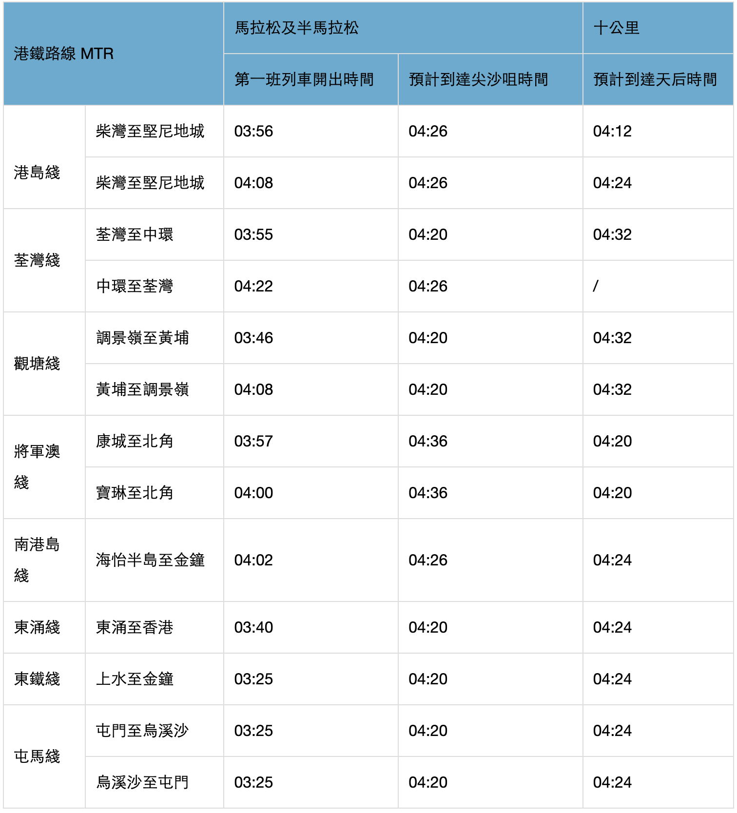 屯馬綫及東鐵綫會於凌晨 3 時 25 分開出,是 8 條港鐵中最早的頭班車,好讓跑手們早點到達尖沙咀或者銅鑼灣。