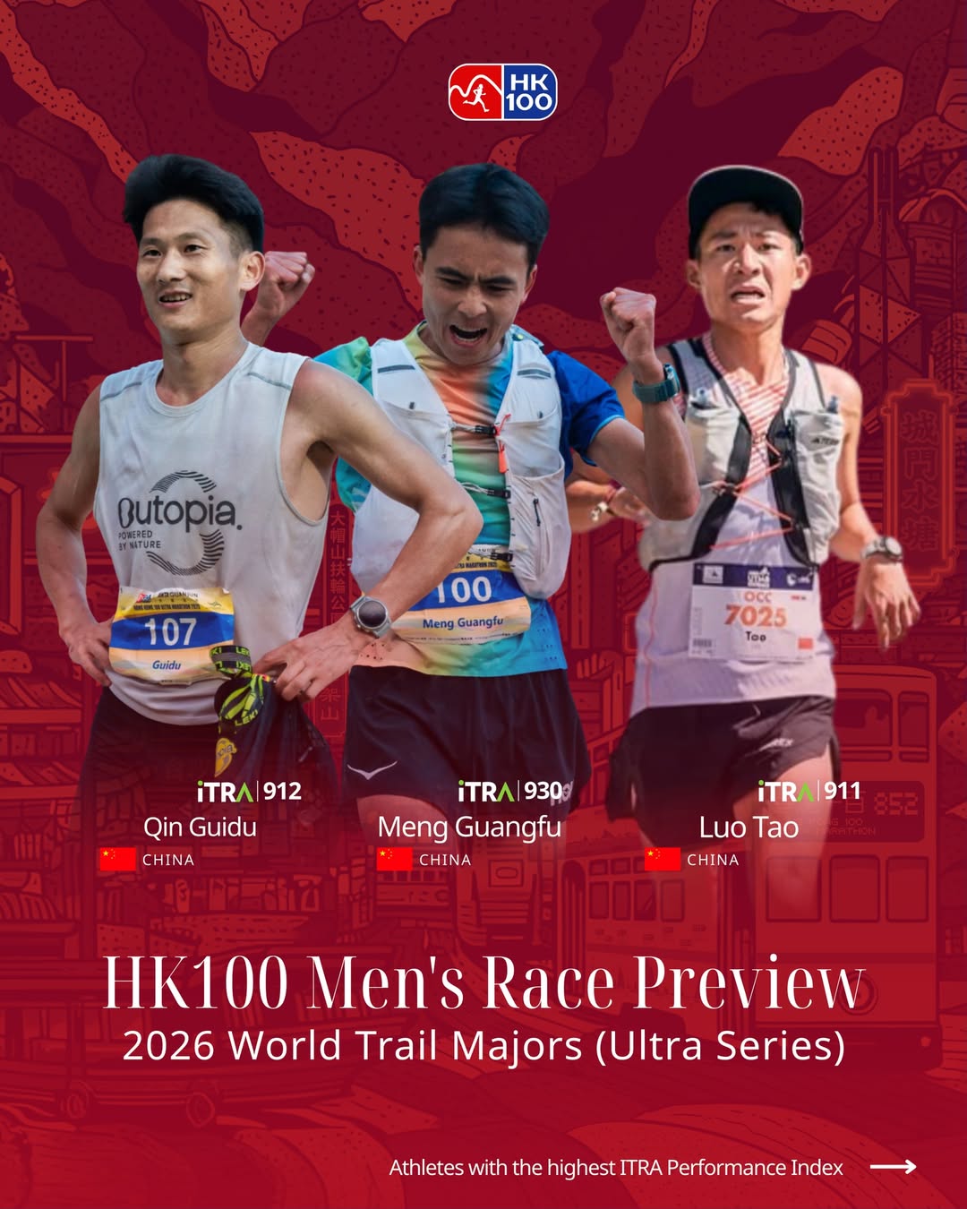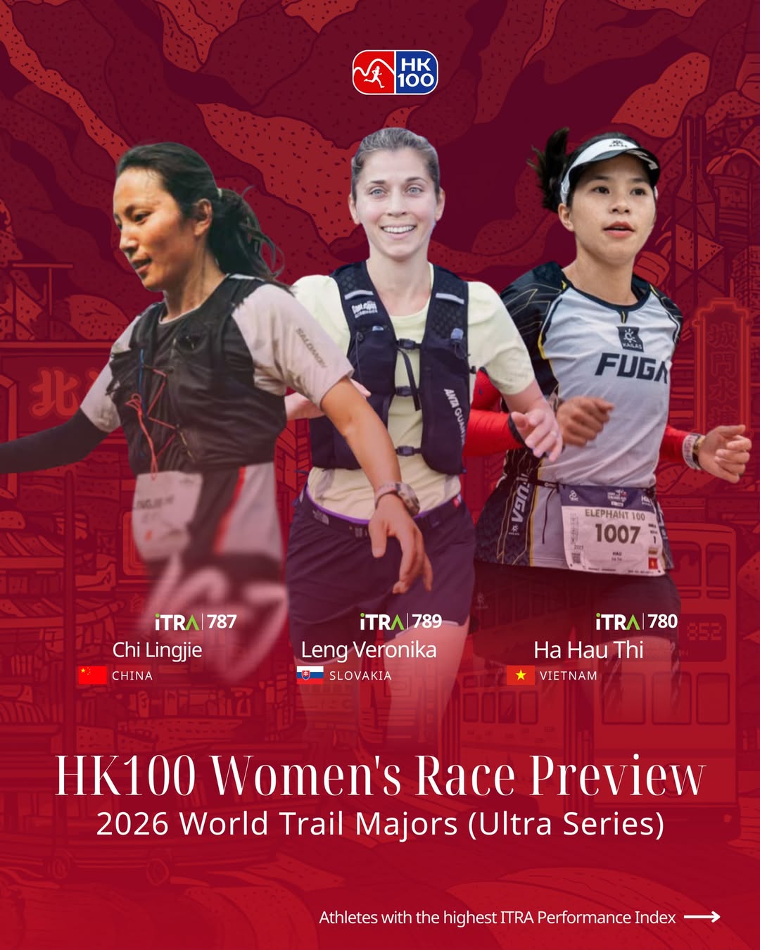 賽事焦點 HK100 女子精英跑手競爭異常激烈,三位奪冠熱門選手之間的 ITRA 積分差距僅 3 分!去年,斯洛伐克選手 Veronika Leng 在賽事中獲得亞軍,並贏得了崇禮超級越野賽冠軍,在 CCC 中獲得第五名。中國選手迟令杰(ITRA 積分787分)去年在該賽事中獲得第五名;越南選手 Kailas Fuga(ITRA 積分 785分)在香港站也獲得第三名。香港選手張敏怡(ITRA 積分 699分)將參加這場主場比賽,她去年曾贏得 Mt.FUJI 100 及 Grampians Peaks Trail 100 Miler冠軍。高水準的競爭和勢均力敵的實力預示著這將是一場精彩的比賽。