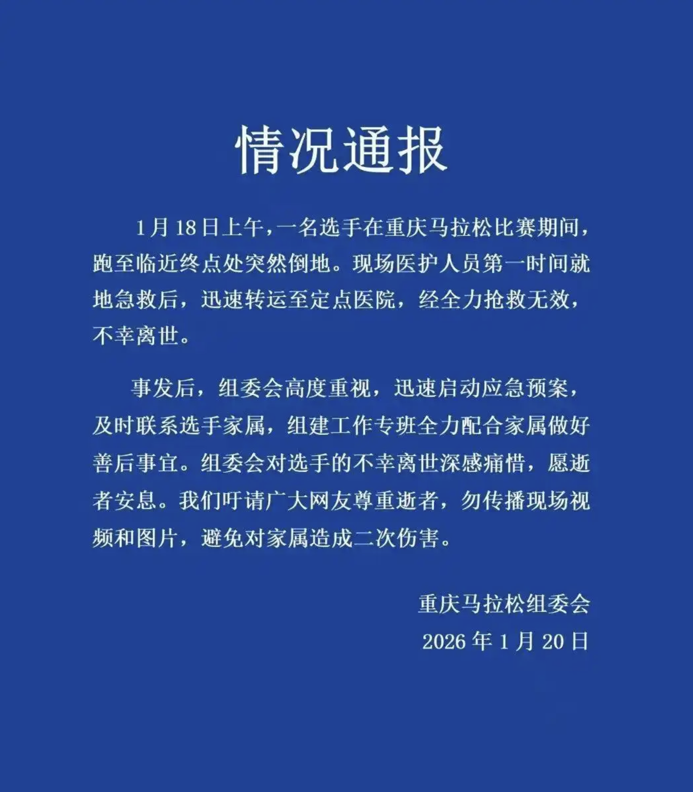組委會發文稱,18 日上午,一名選手在重慶馬拉松比賽期間,跑至臨近終點處突然倒地。現場醫護人員第一時間就地急救後,迅速轉運至定點醫院,經全力搶救無效,不幸離世。事發後,組委會高度重視,迅速啟動應急預案,及時聯系選手家屬,組建工作專班全力配合家屬做好善後事宜。組委會對選手的不幸離世深感痛惜,願逝者安息。