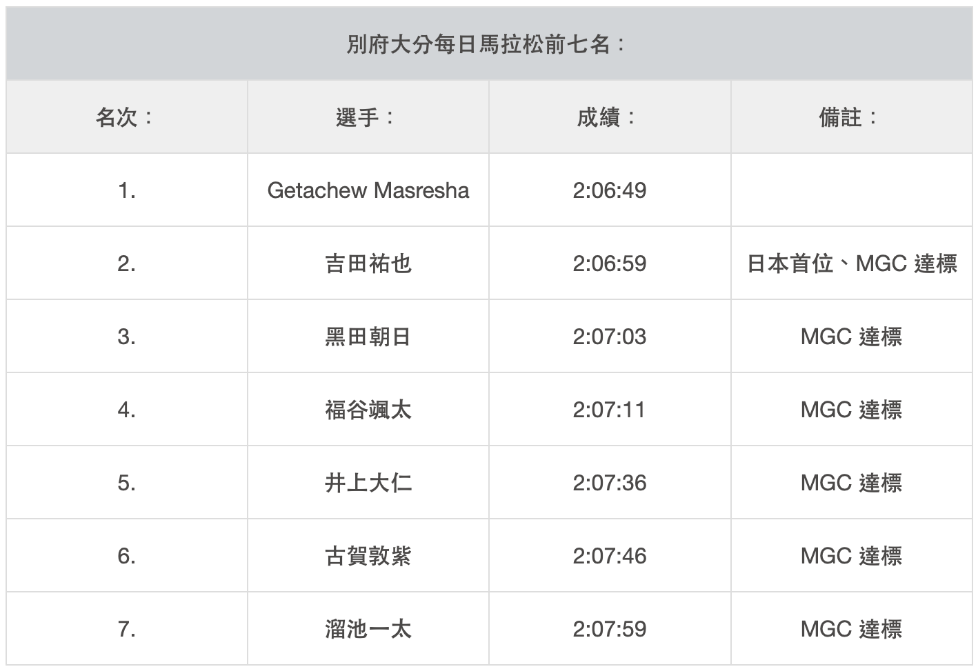 而本屆別府大分馬拉松賽事前六名日本選手(至溜池一太為止)皆順利獲得了 MGC(馬拉松大賽冠軍賽) 的參賽資格。對於這群選手來說,別府大分的終點線並非終點,將會是邁向奧運夢想的全新起點。