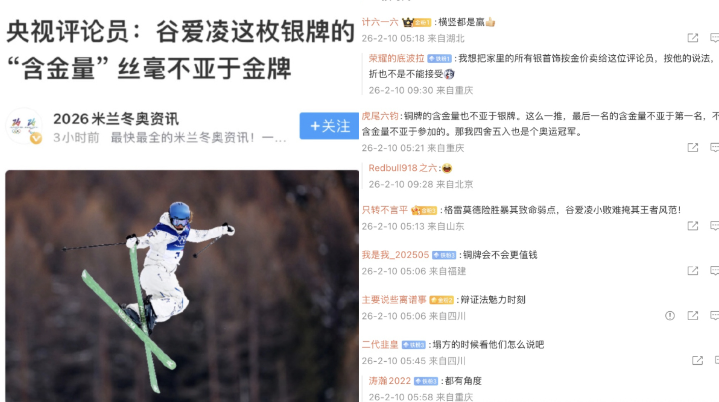 正於米蘭舉行的 2026 年米蘭冬季奧運會中,入籍中國參賽的焦點運動員谷愛凌,於自由式滑雪坡面障礙技巧賽項目中奪得一面銀牌,谷得獎後,央視評論員隨即發布評論,表示谷愛凌此銀牌「不亞於金牌」,評論一出隨即惹來網絡熱話及嘲諷,有網民更直言:「承認別人比自己強太難了!」