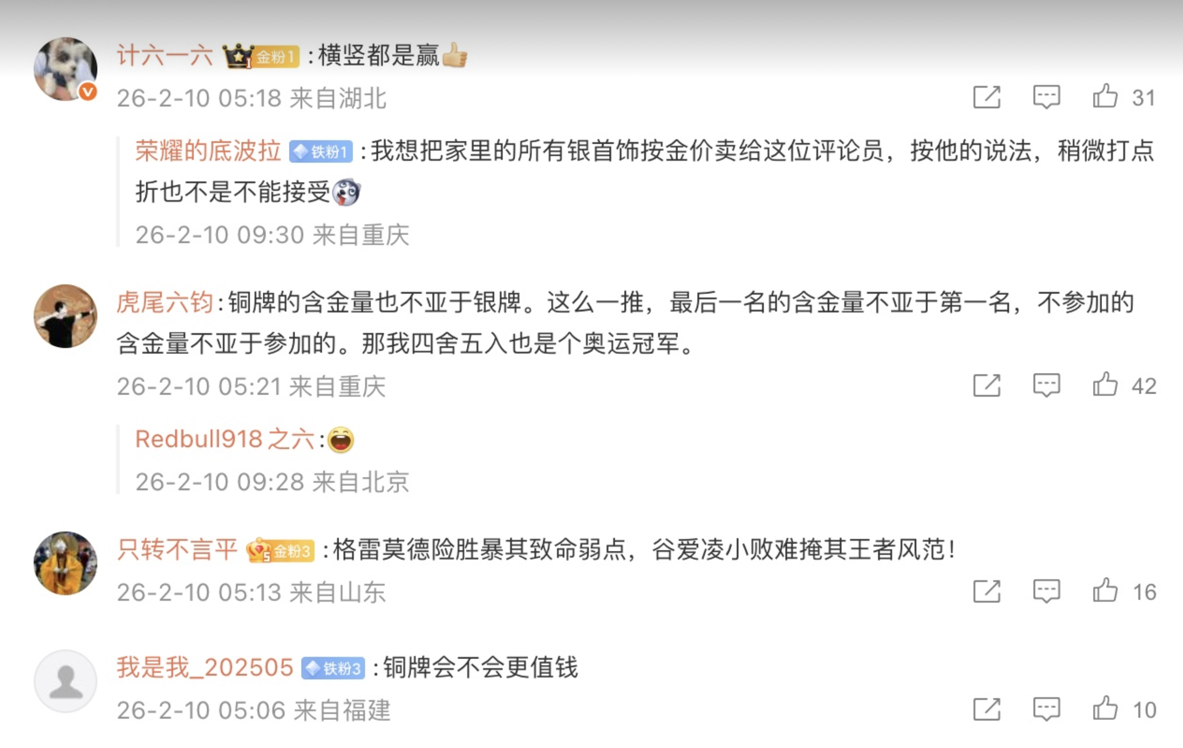 評論一出,內地多個網絡媒體即以《央視評論員:谷愛凌這枚銀牌的「含金量」 絲毫不亞於金牌》作討論及熱搜,評論亦瞬間引發了網友一片嘲諷。有網友稱:「我想把家裡的所有銀首飾按金價賣給這位評論員,按他的說法,稍微打點折也不是不能接受」、「這麼一說我拿銀條換金條是不是也符合邏輯」、「銀牌的含銀量絕對比金牌高」、「拿著納稅人的錢自嗨挺好的」。亦有網友直言:「承認別人比自己強太難了!」