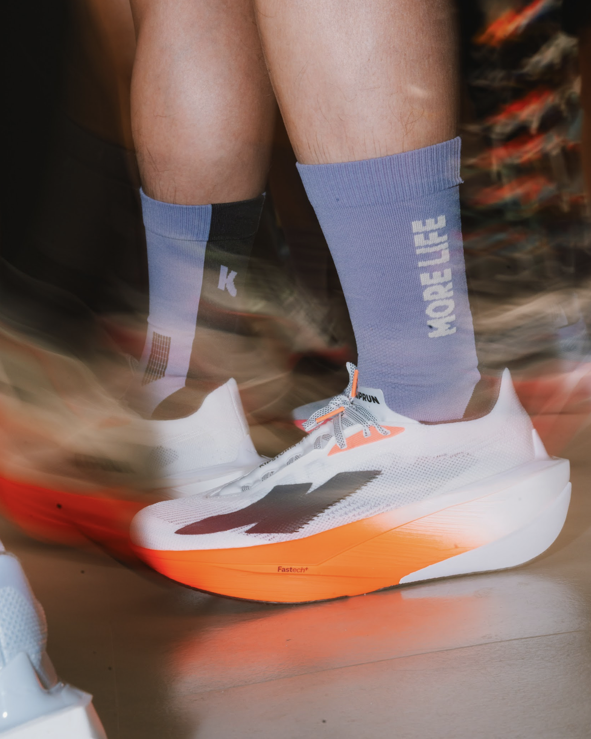 筆者特別喜愛跑鞋襪套式無鞋舌針織鞋面強化包覆與透氣度,適合間歇訓練與中高速配速跑需求。同時,Kipstorm Tempo 擁有系列最高的 45mm 後跟厚度,仍維持 225 克輕量,在提供穩定保護的同時,為日常節奏跑與速度訓練帶來強勁爆發力。