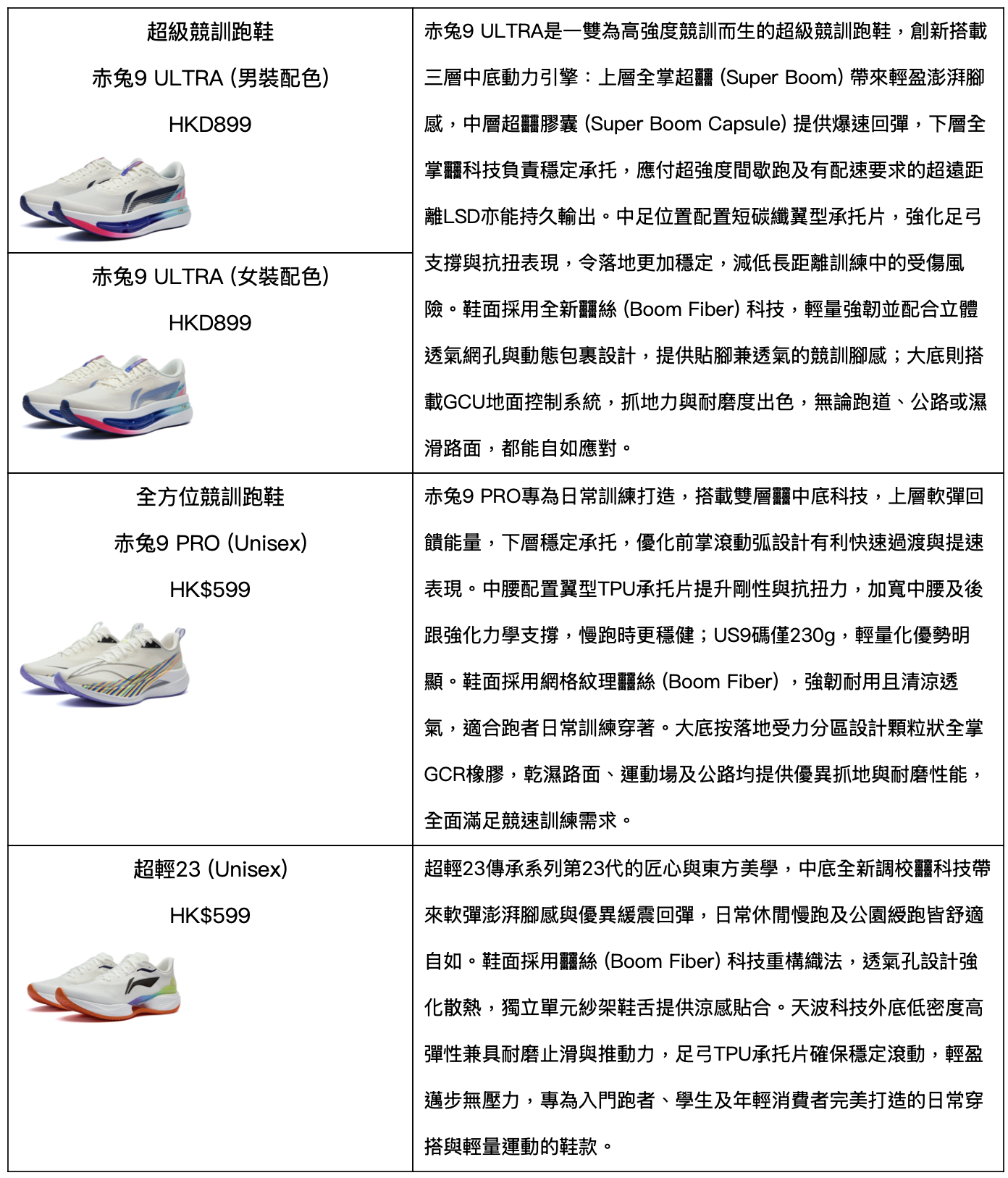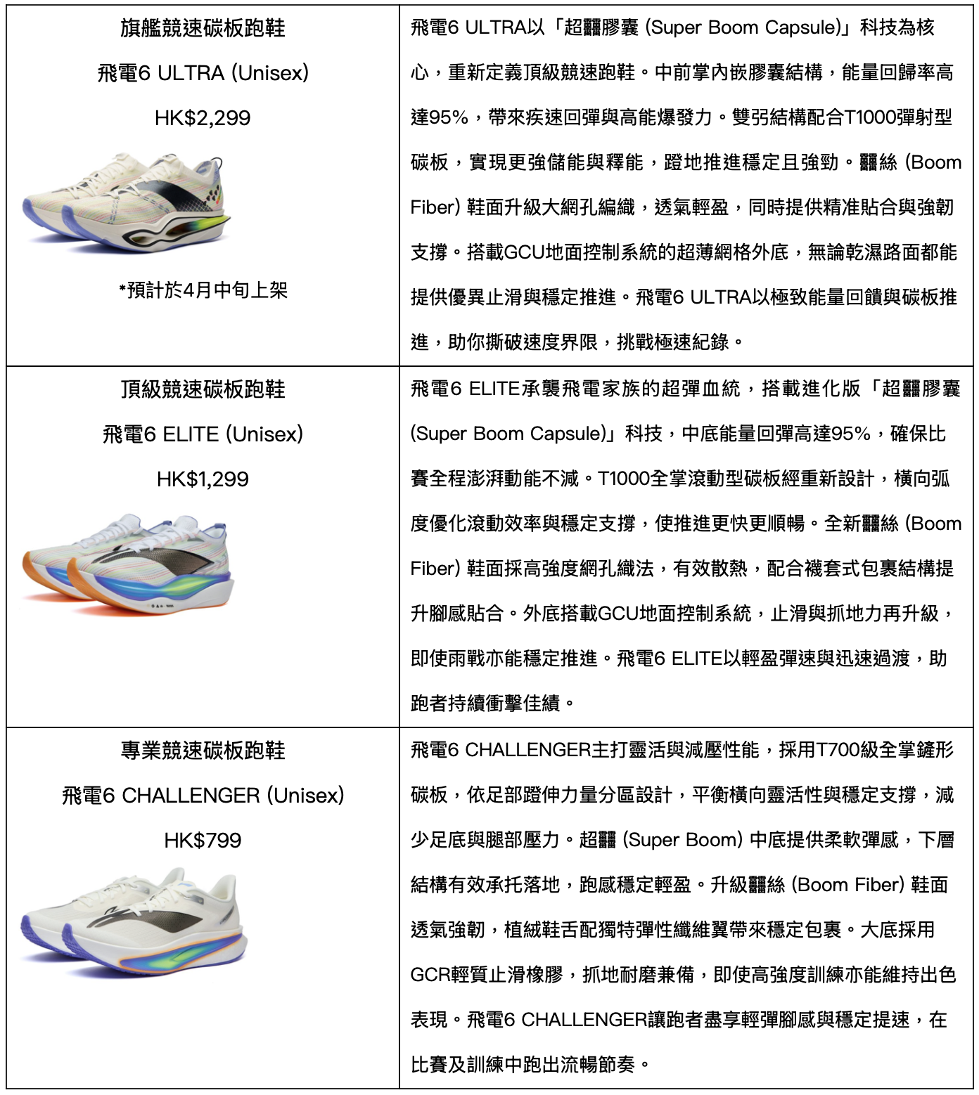 這次亮相的「幻彩」新配色系列 - 將於飛電6、赤兔 9 及超輕 23 系列同步登場,預計於 4 月 1 日起在香港Li-Ning 門店全面上架,讓跑者親身感受品牌將「競速科技」化為動能的非凡魅力。