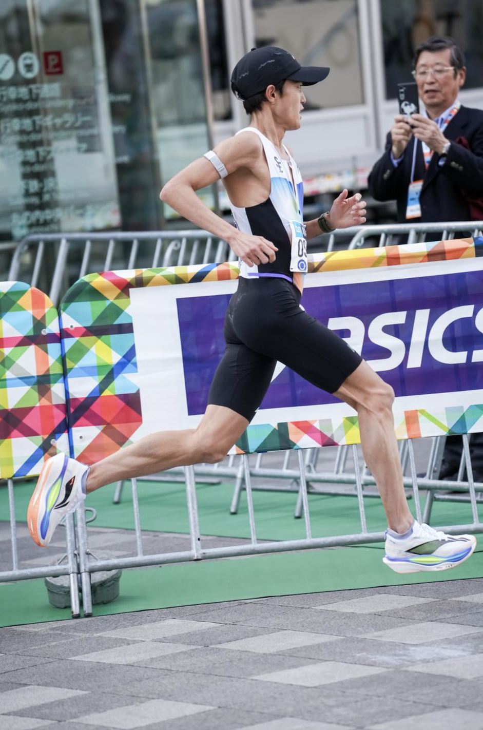 大迫傑身著飛電 6 ELITE 碳板科技全新配色跑鞋及專屬訂製賽服,以沉穩節奏及強勢衝刺姿態,全程主導賽事, 吸引全球目光聚焦 Li-Ning 領先科技的實戰威力。