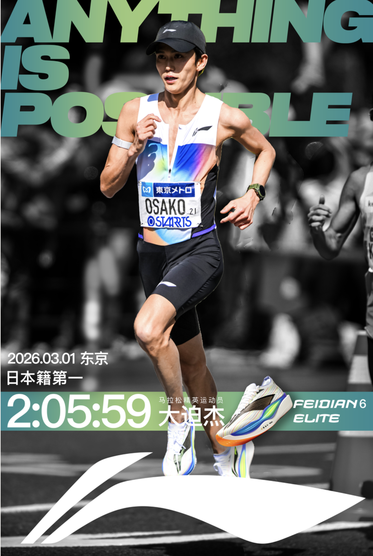 Li-Ning 作為全球知名的專業體育用品品牌,持續支持全球頂尖跑手,積極推動國際跑步文化發展。在今日舉行的東京馬拉松 2026 賽事中,Li-Ning 贊助的多位國際及中國精英跑手表現出色,日本馬拉松紀錄保持者大迫傑更跑出 2:05:59 勇奪日本本土選手第一名,於主場賽道締造輝煌,成為全場焦點。