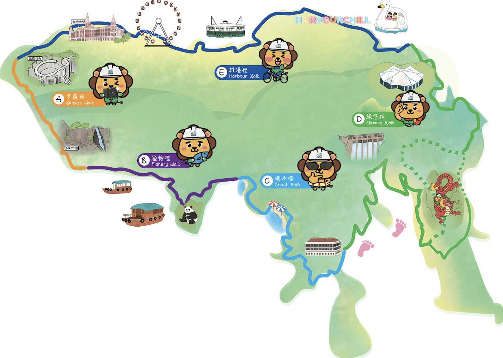 環島長廊共分為 5 段主題路徑,包括維港徑、夕霞徑、漁怡徑、晴沙徑及綠悠徑,市民分別可體驗多元化海濱空間,也可欣賞壯麗日落,發掘香港漁業文化和歷史。