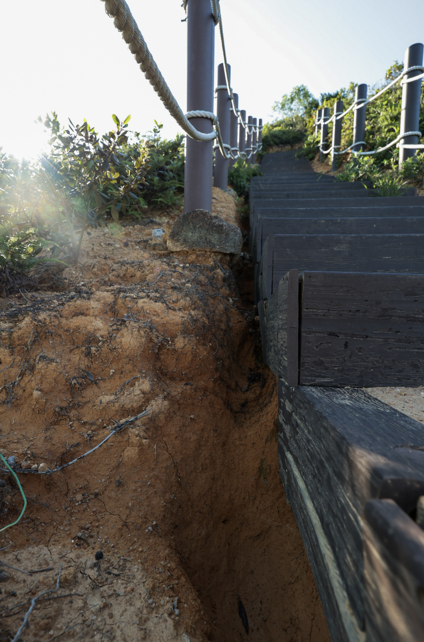 「郊遊徑石屎化關注小組」日前發表帖文,發現環嶼徑工程的路段之一,大嶼山的大陰頂行山徑出現不少問題,小組現場所現,近山頂的梯級邊緣出現了明顯縫隙,部分支撐梯級的金屬支架已然外露。在修建山徑時,過度開挖的地點如未妥善處理,鬆散的土壤很容易成為雨水侵蝕的缺口,關注小組負責人擔心在不久的將來,會危害到路基的穩定性。此外,關注小組亦發現,部分固定欄杆的水泥基座亦同樣外露,甚至有些塑木框架的組件更已完全鬆脫。小組質疑土拓署是否如之前所言會「持續監察」?還是已交託當區民政處處理,撒手不管?