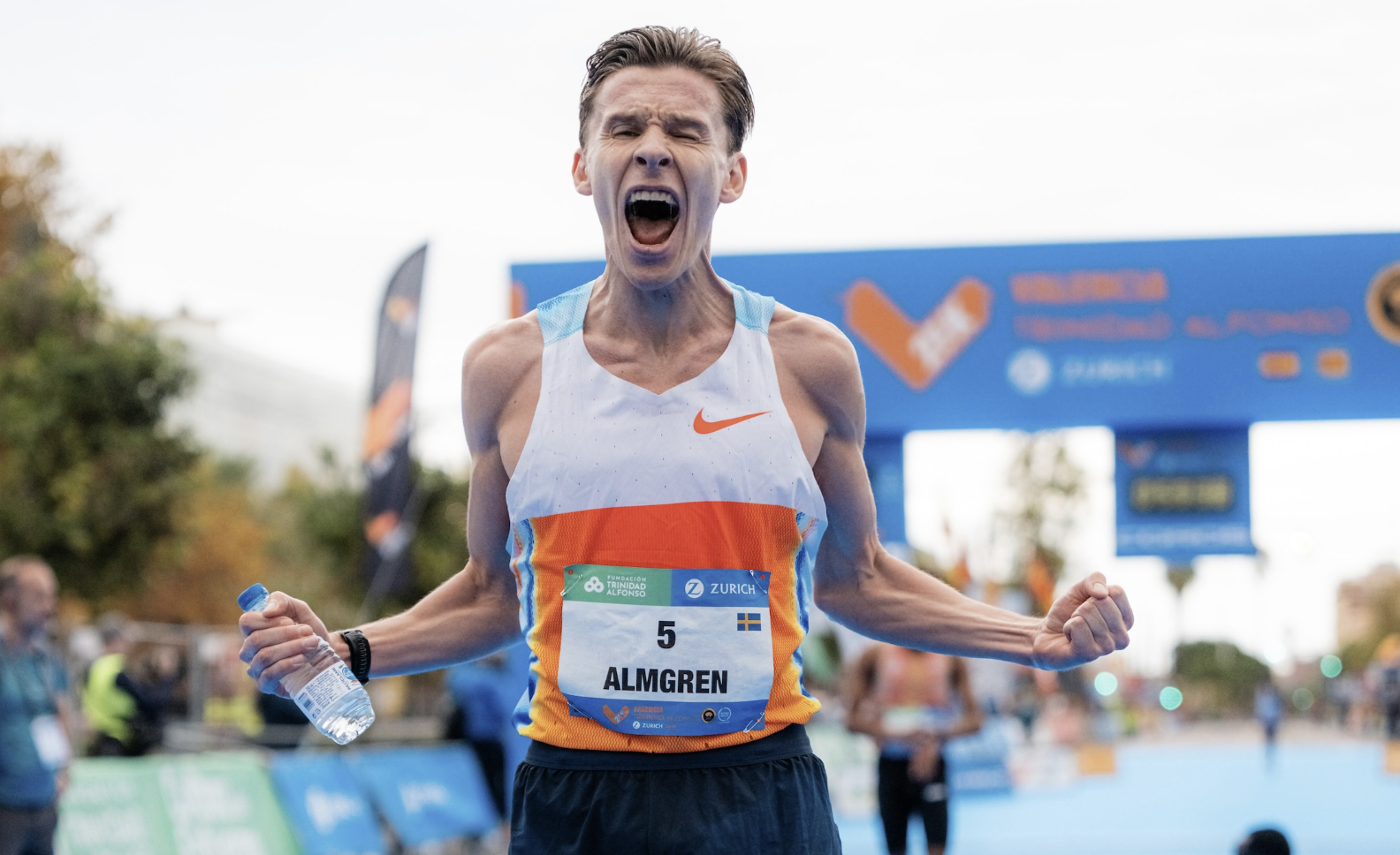 在本次挑戰半馬紀錄前,Almgren 才在東京世界錦標賽男子一萬公尺斬獲一枚銅牌,僅次於法國金牌 Jimmy Gressier 與銀牌 Yomif Kejelcha,他在世錦賽後就立馬將目標鎖定在了本次華倫西亞的半程馬拉松紀錄。