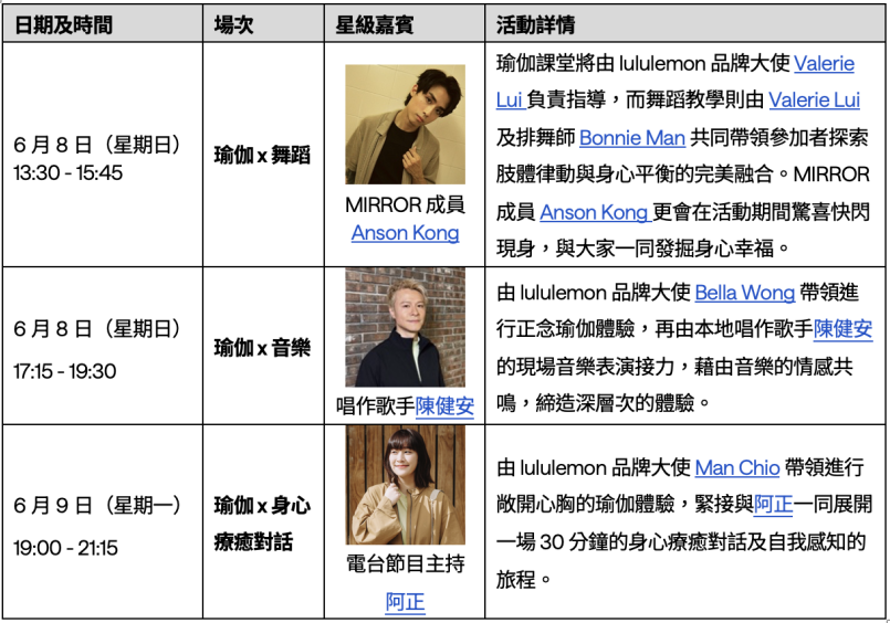 是次活動每節均結合瑜伽及流行文化元素,並分別邀請一位星級嘉賓現身出席,包括 MIRROR 成員 Anson Kong、 唱作歌手陳健安及電台節目主持阿正,與大家一同探索分享。